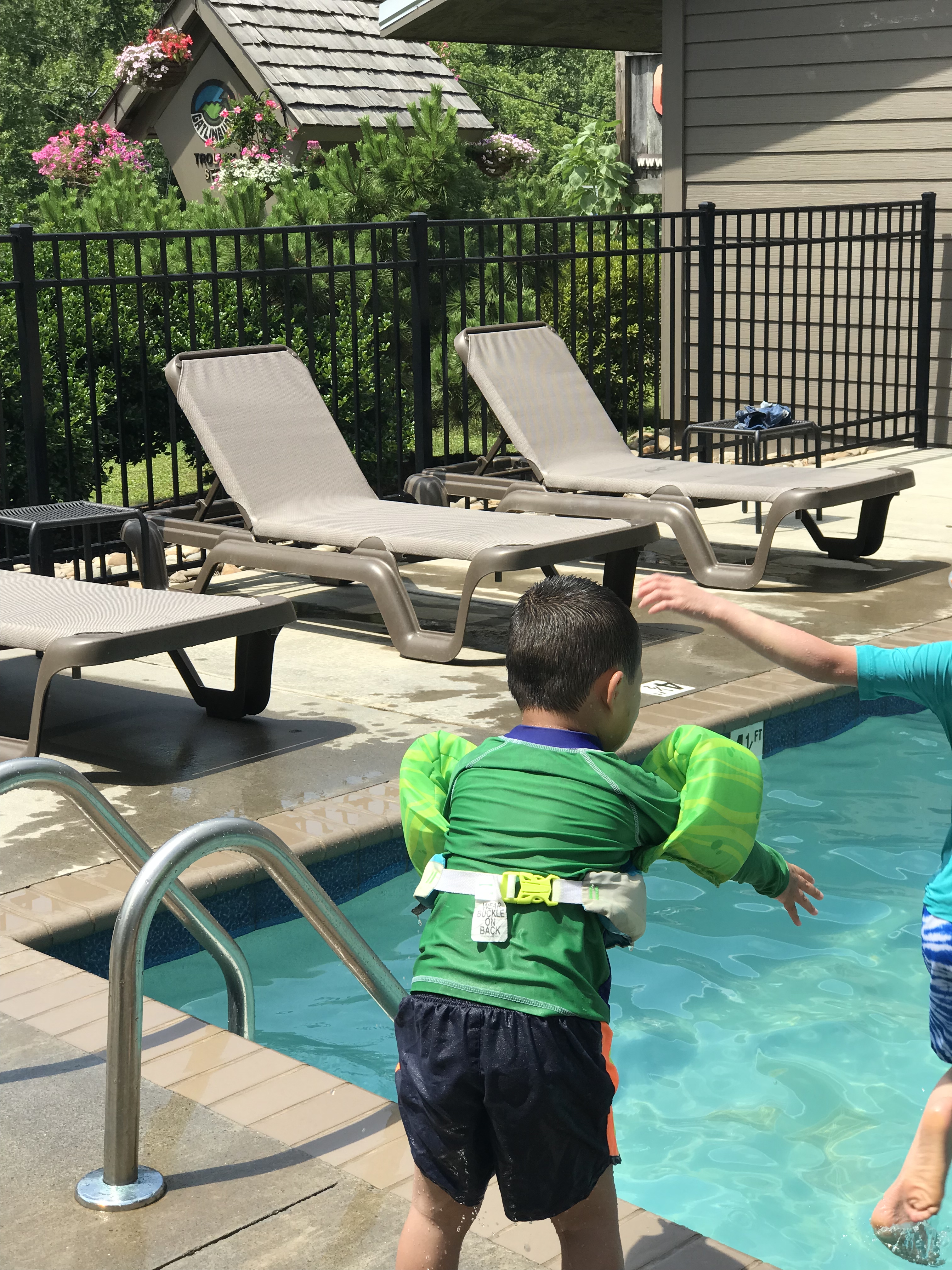 It was approaching 90 degrees with high humidity by the time the boys finished their Quaker Oats Maple Sugar Oatmeal at 11. The plan for the day. Swim. Get Lucas some proper shoes. He remained and remains steadfast in his determination to never sit in the hiking backpack. Hike to Laurel Falls. A short but supposedly beautiful hiking loop in Great Smokie National Park.