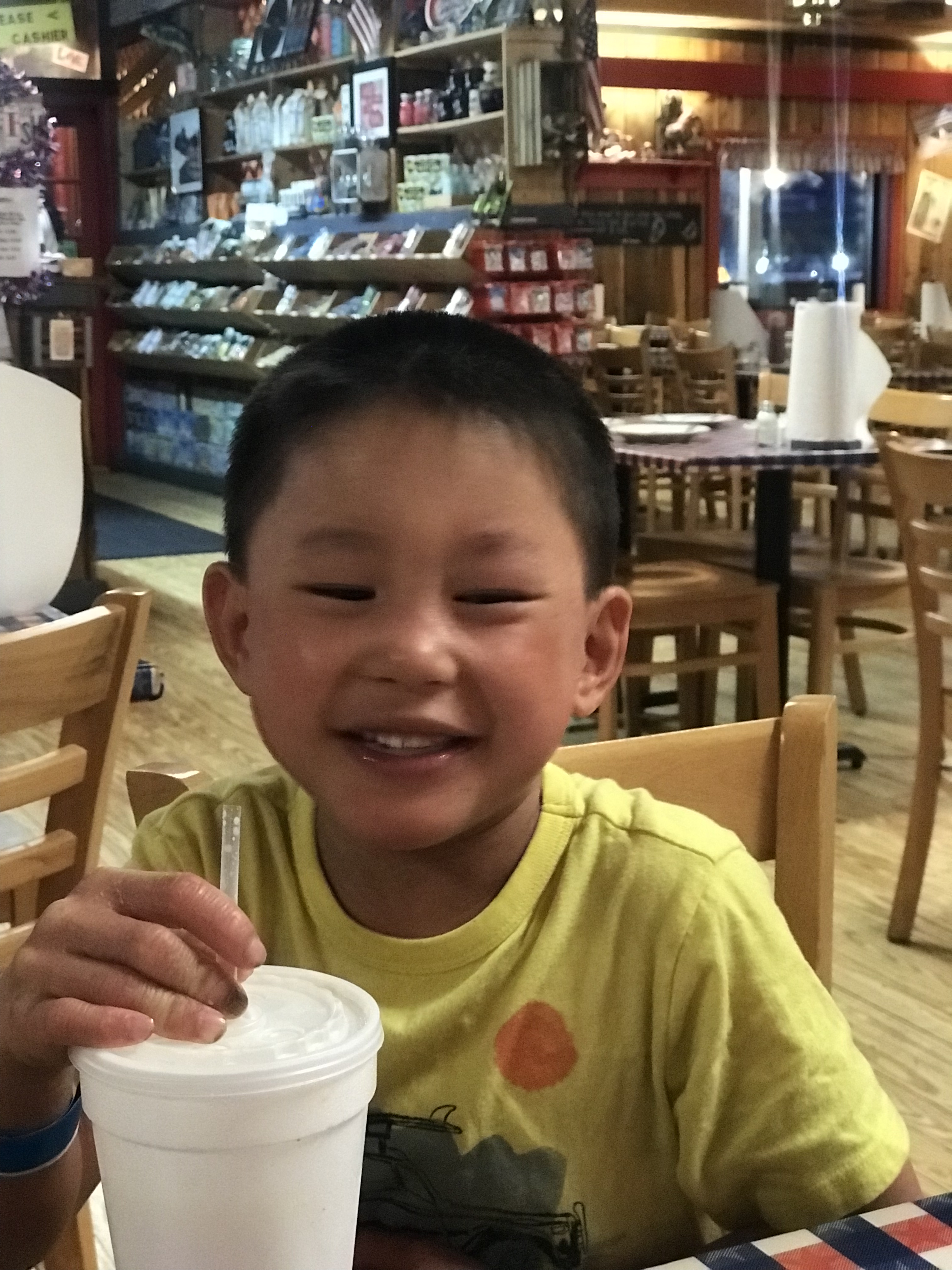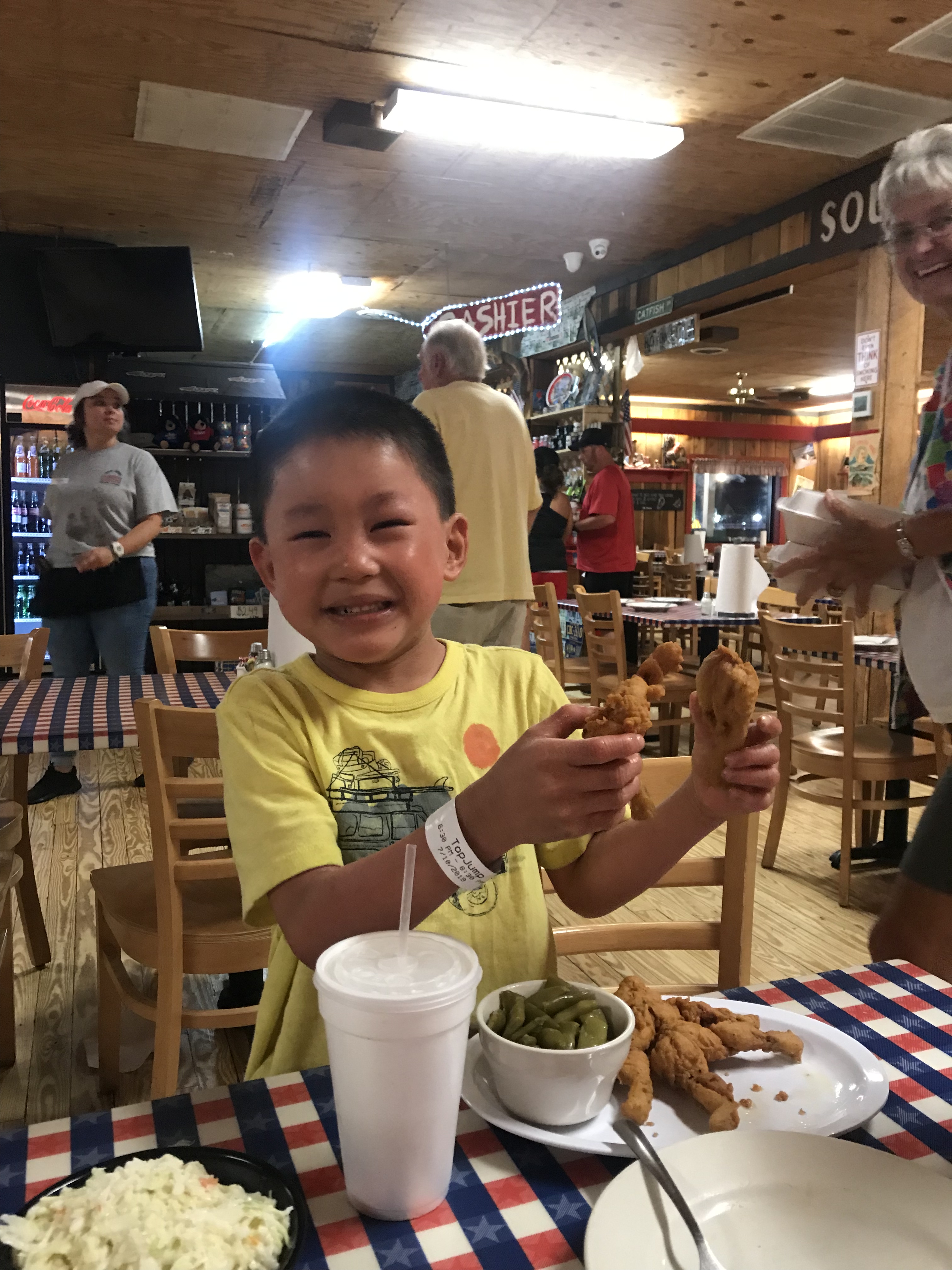 Two happy boys. Will with a plate of frog legs devoured in short order. Lucas still eating his last hushpuppy when we hit the camp bathroom after stopping to get ice and driving a half hour back to the campground. Refusing to relinquish it even when he was peeing.