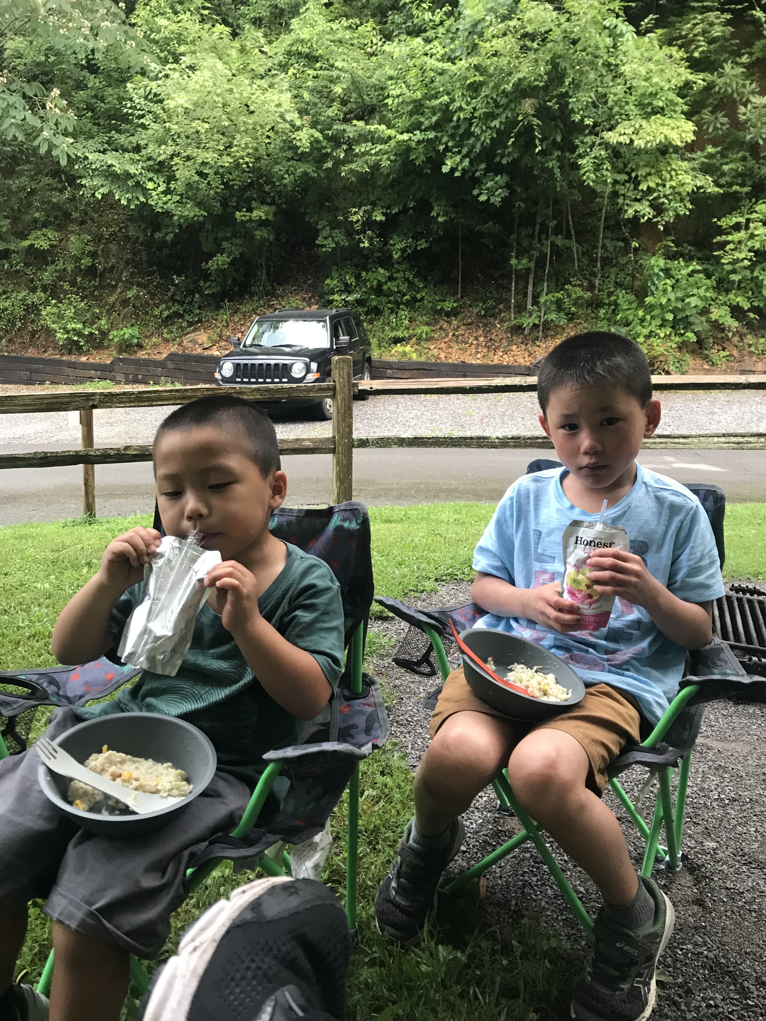 After the boys’ first showers in a couple days (unless you count the pool as a shower), we had breakfast at the campsite.