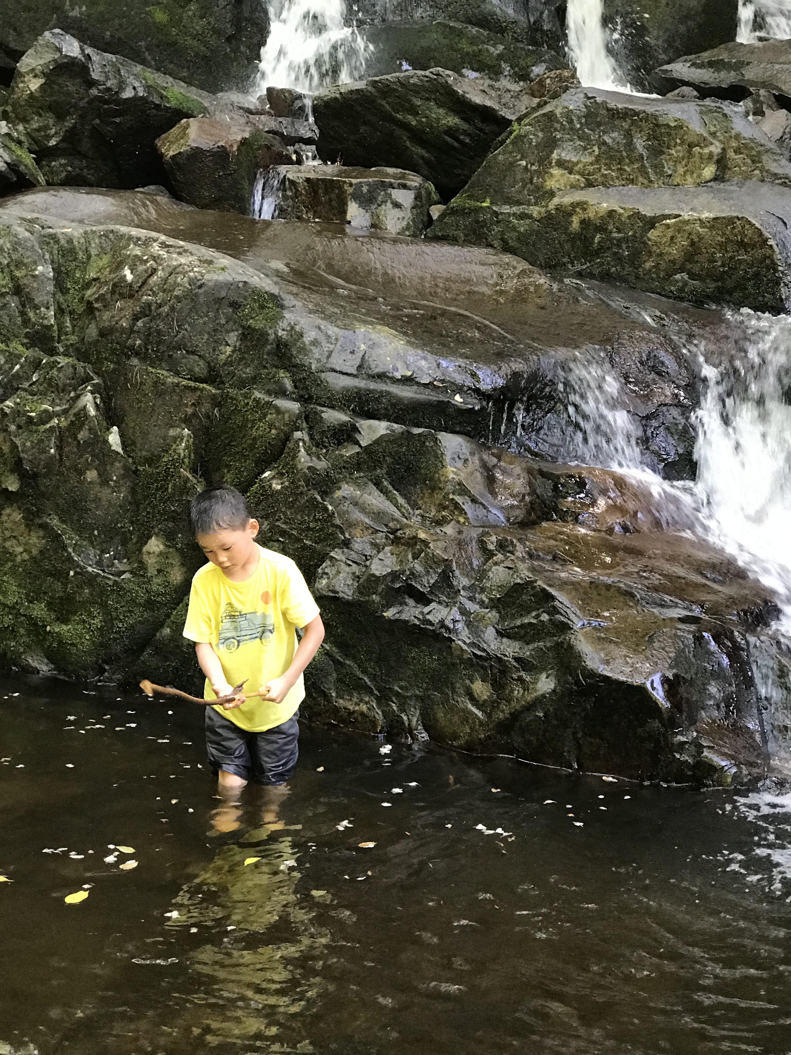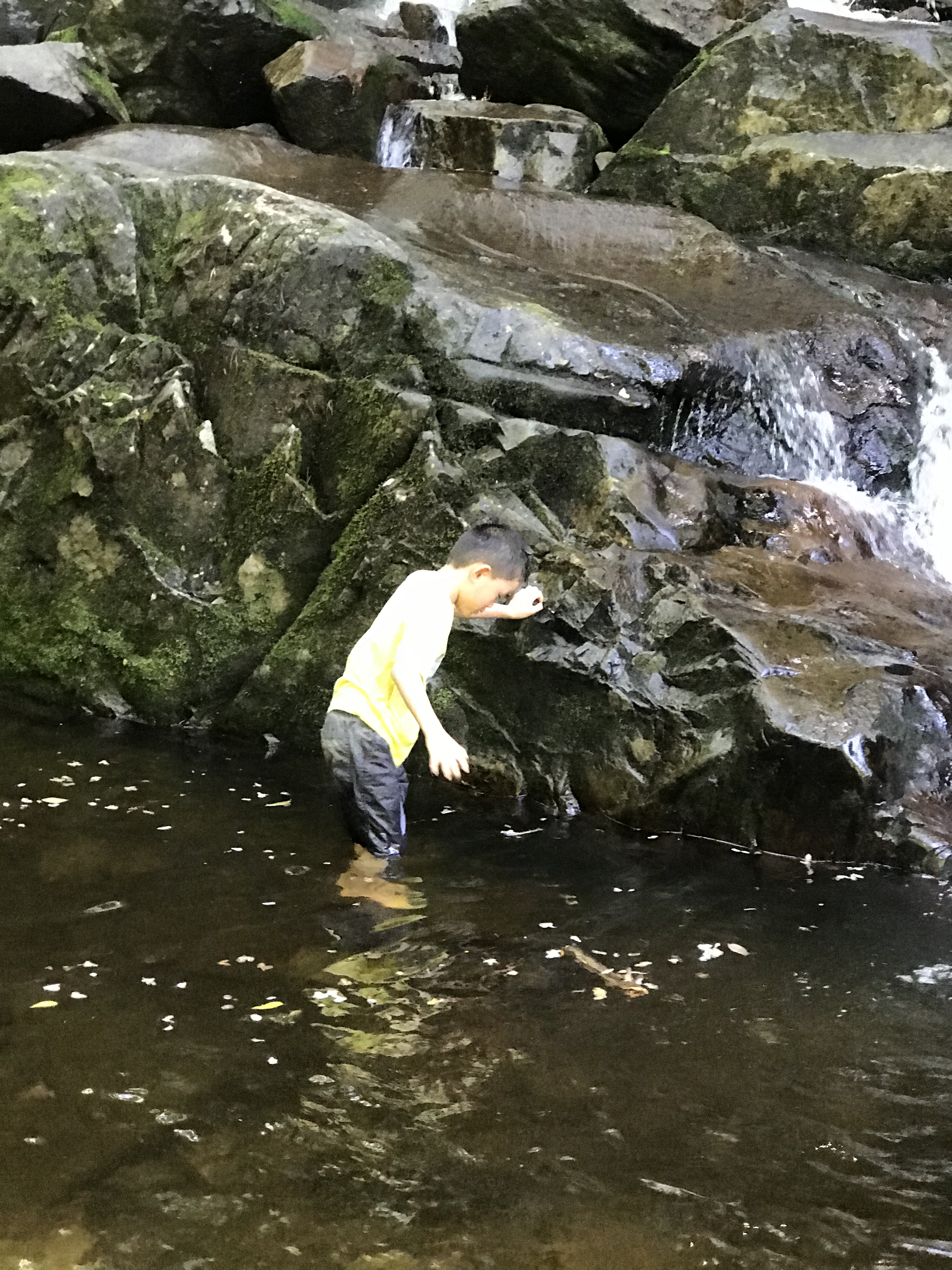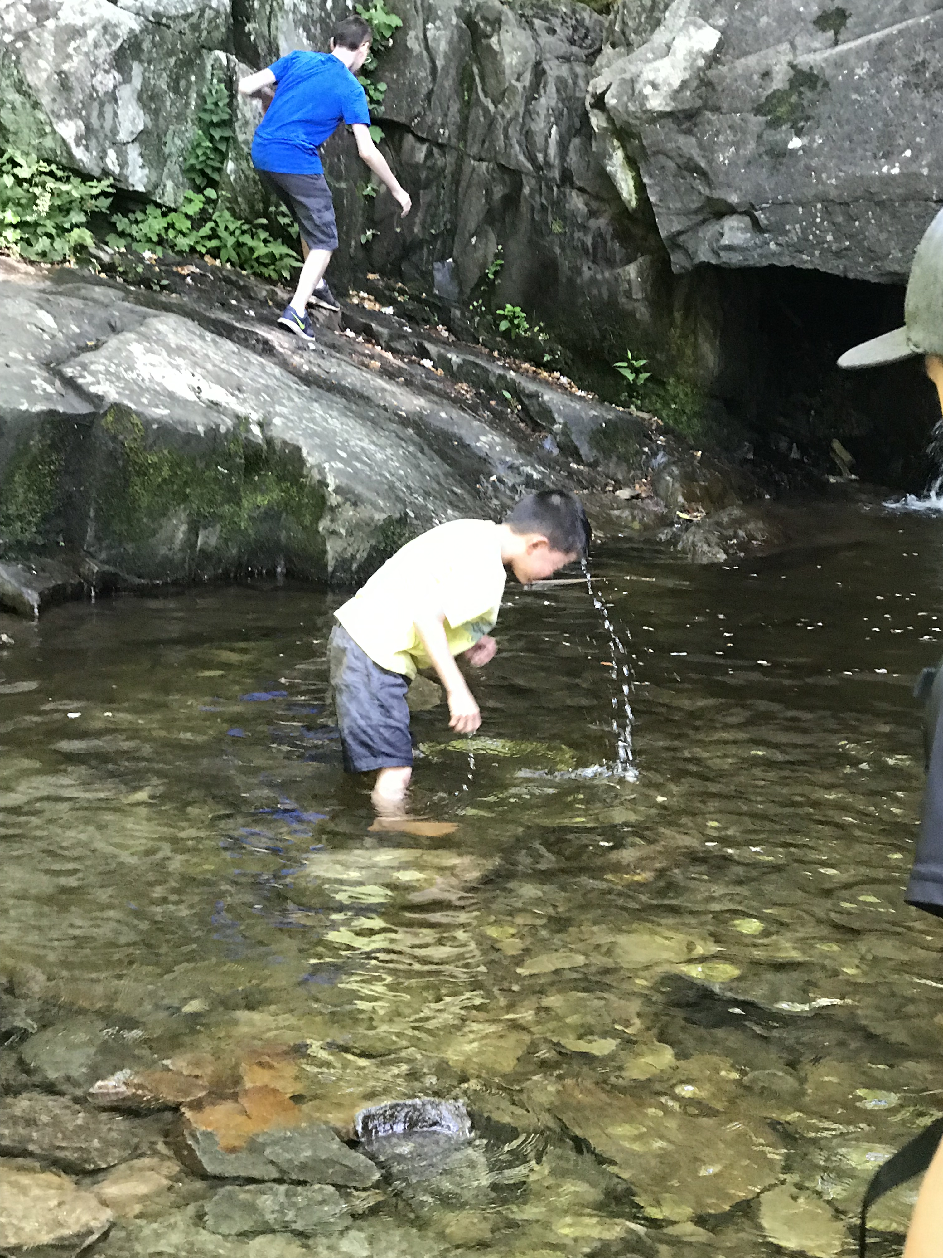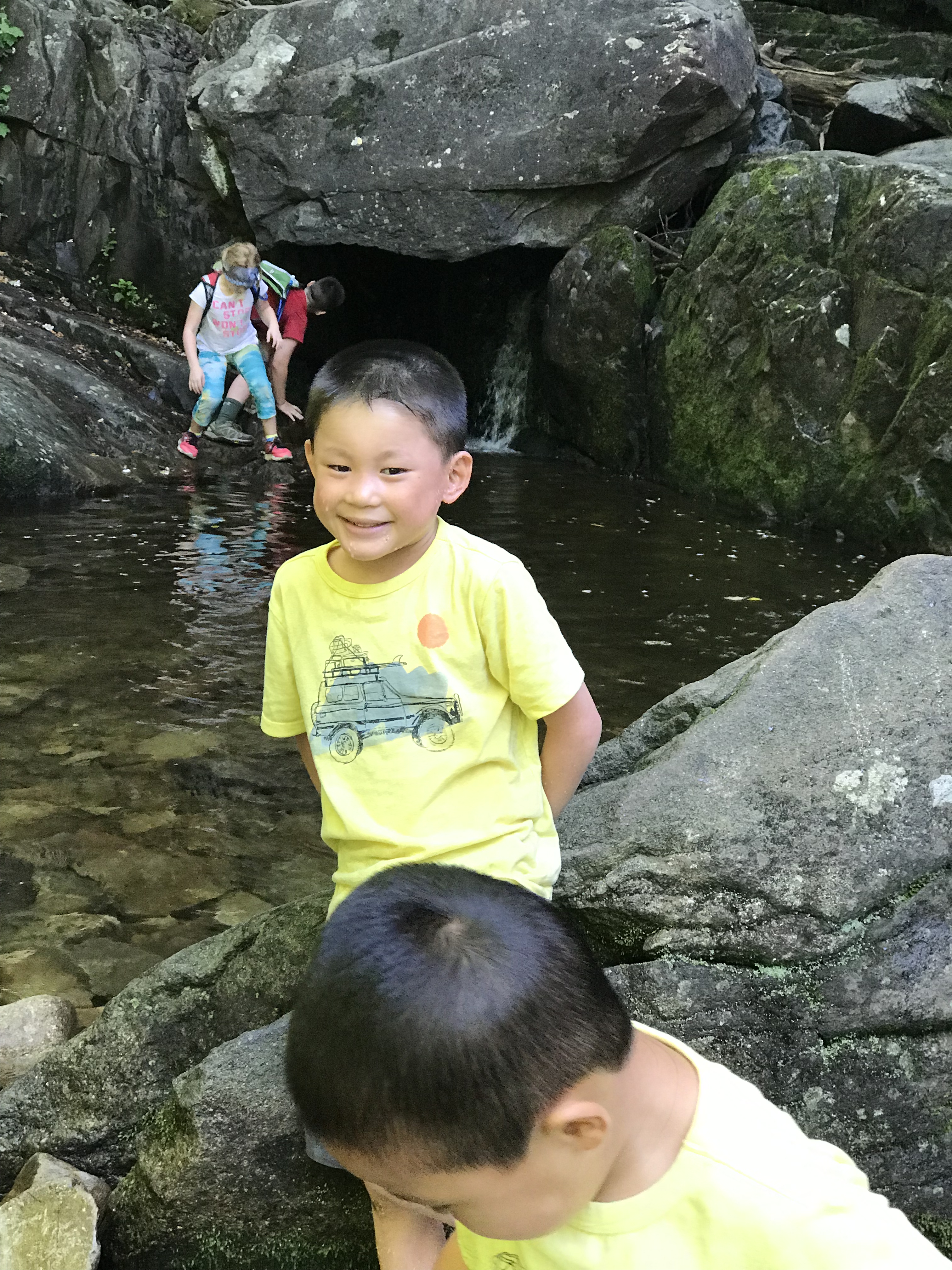 Once we arrived, they turned the pool and stream into a pre-historic playground. Running around. Exploring hidden corners. Will dunking his head in the cool mountain water. “I love mountain water.”