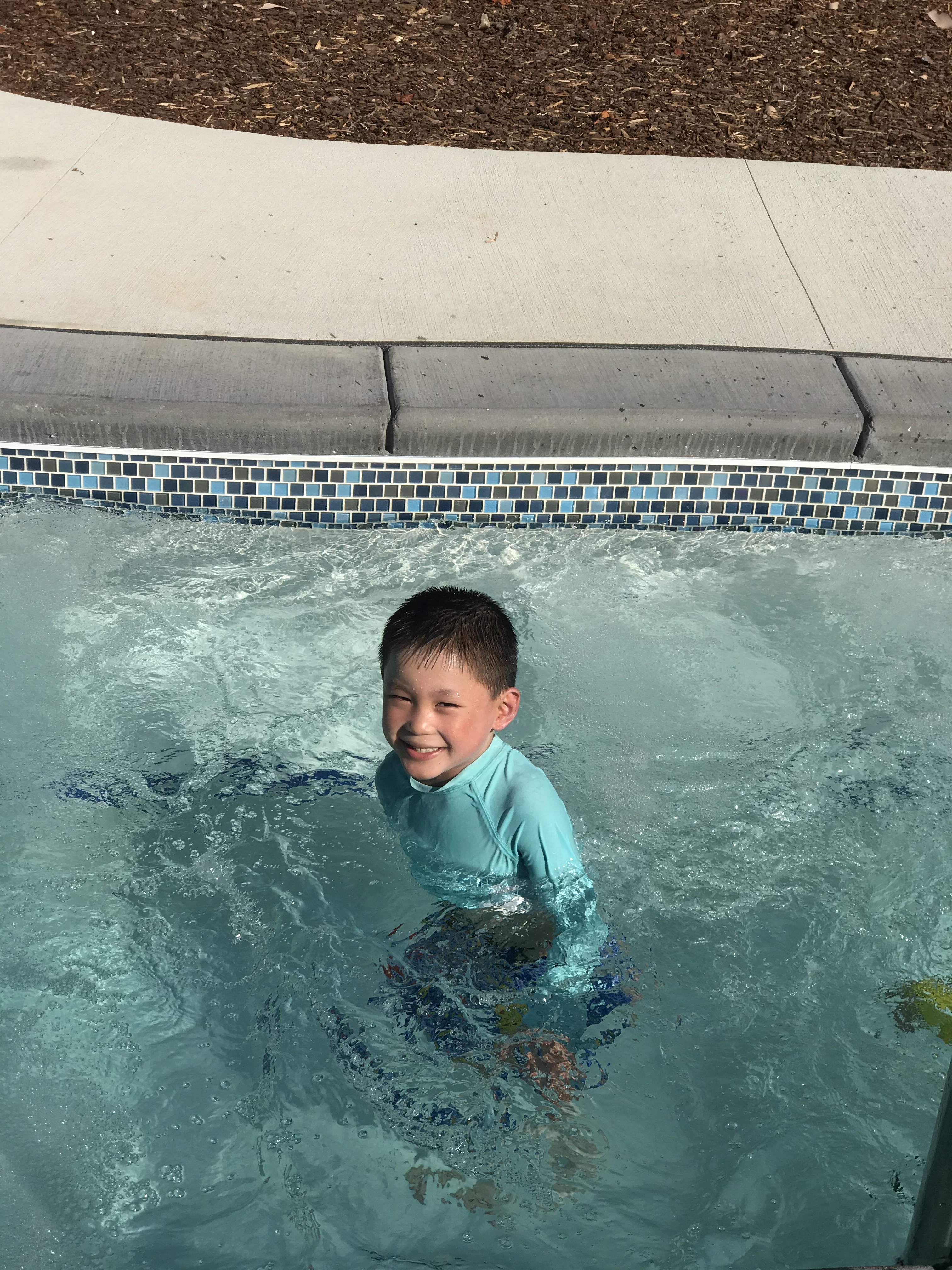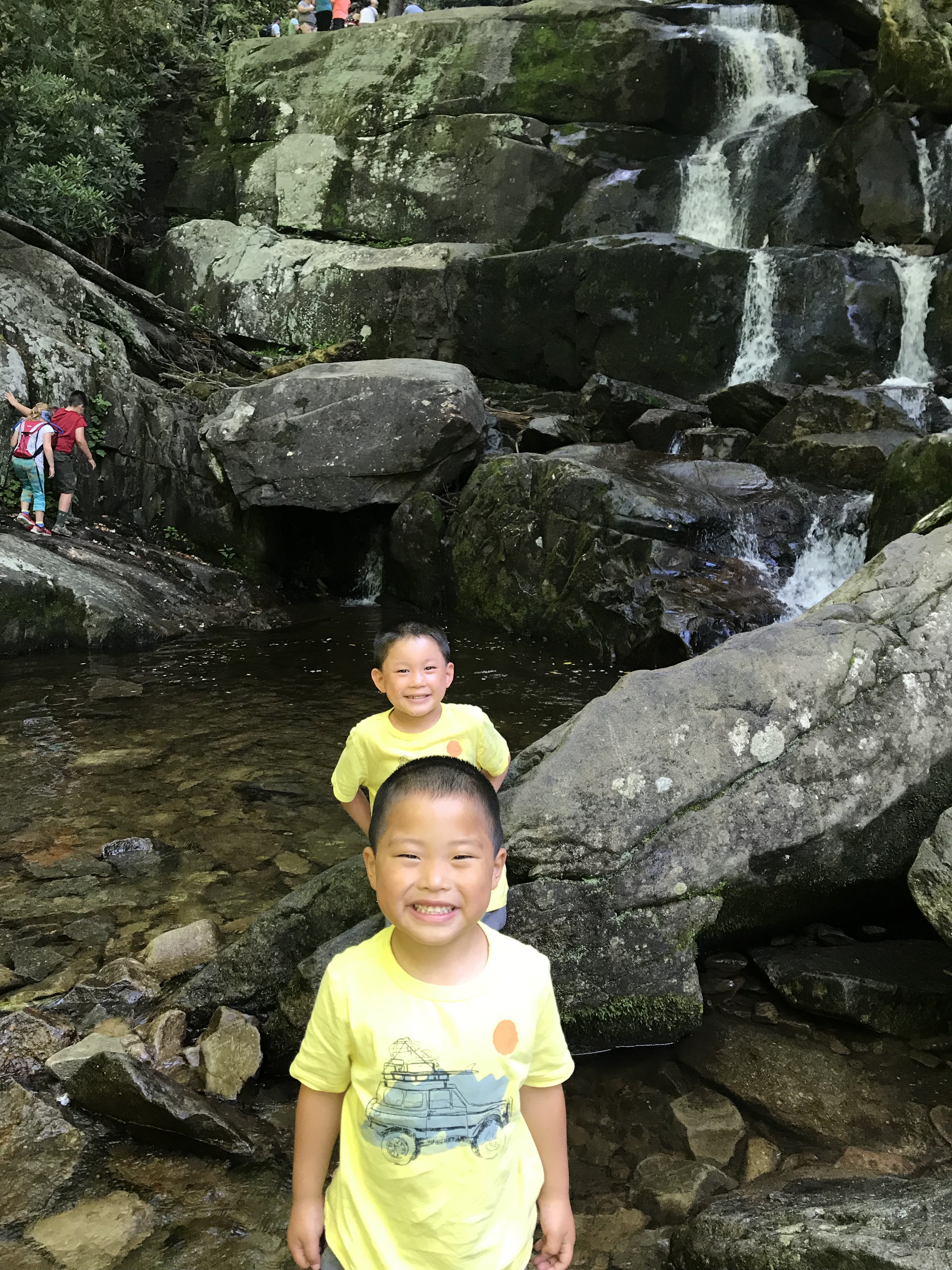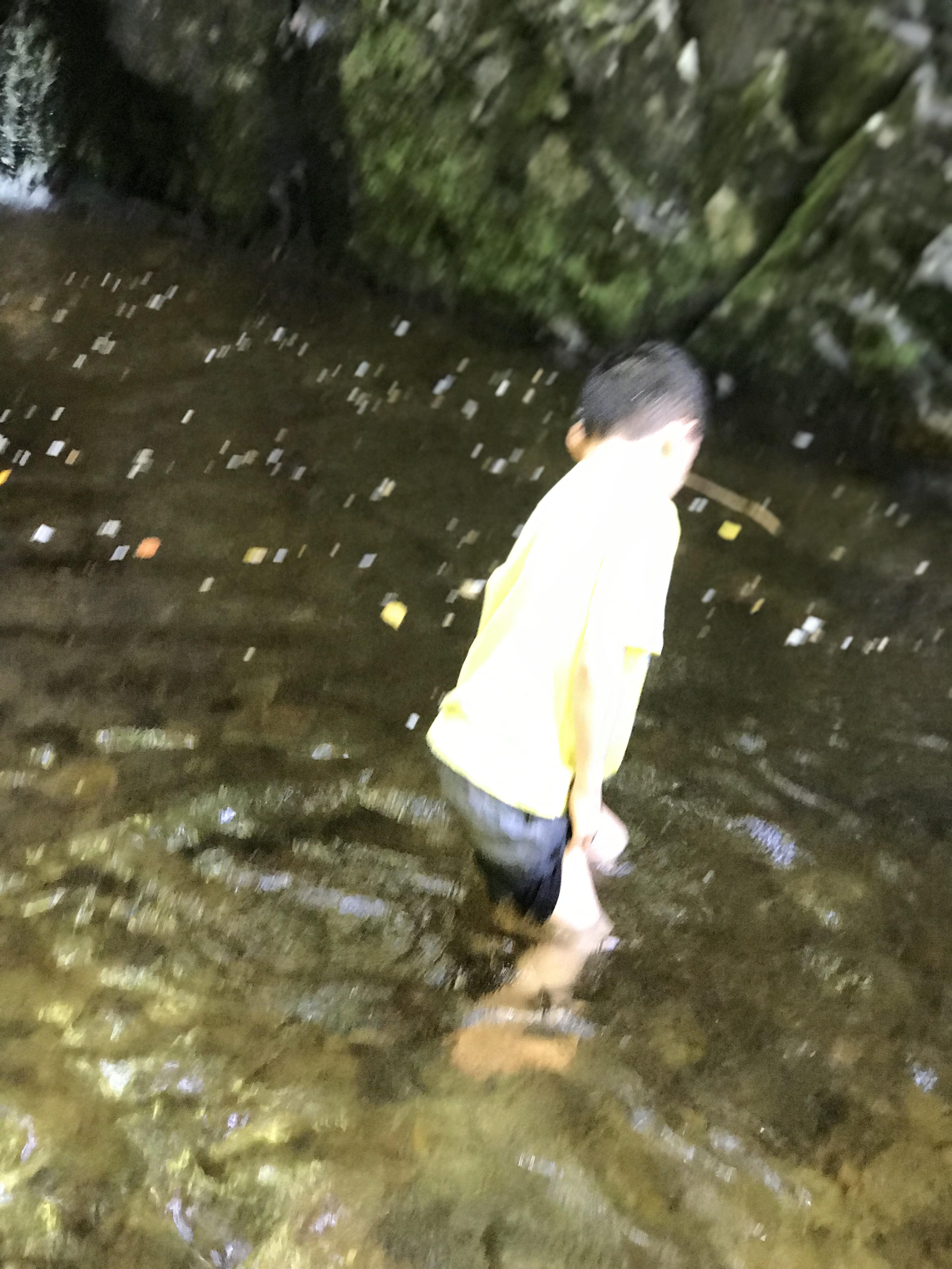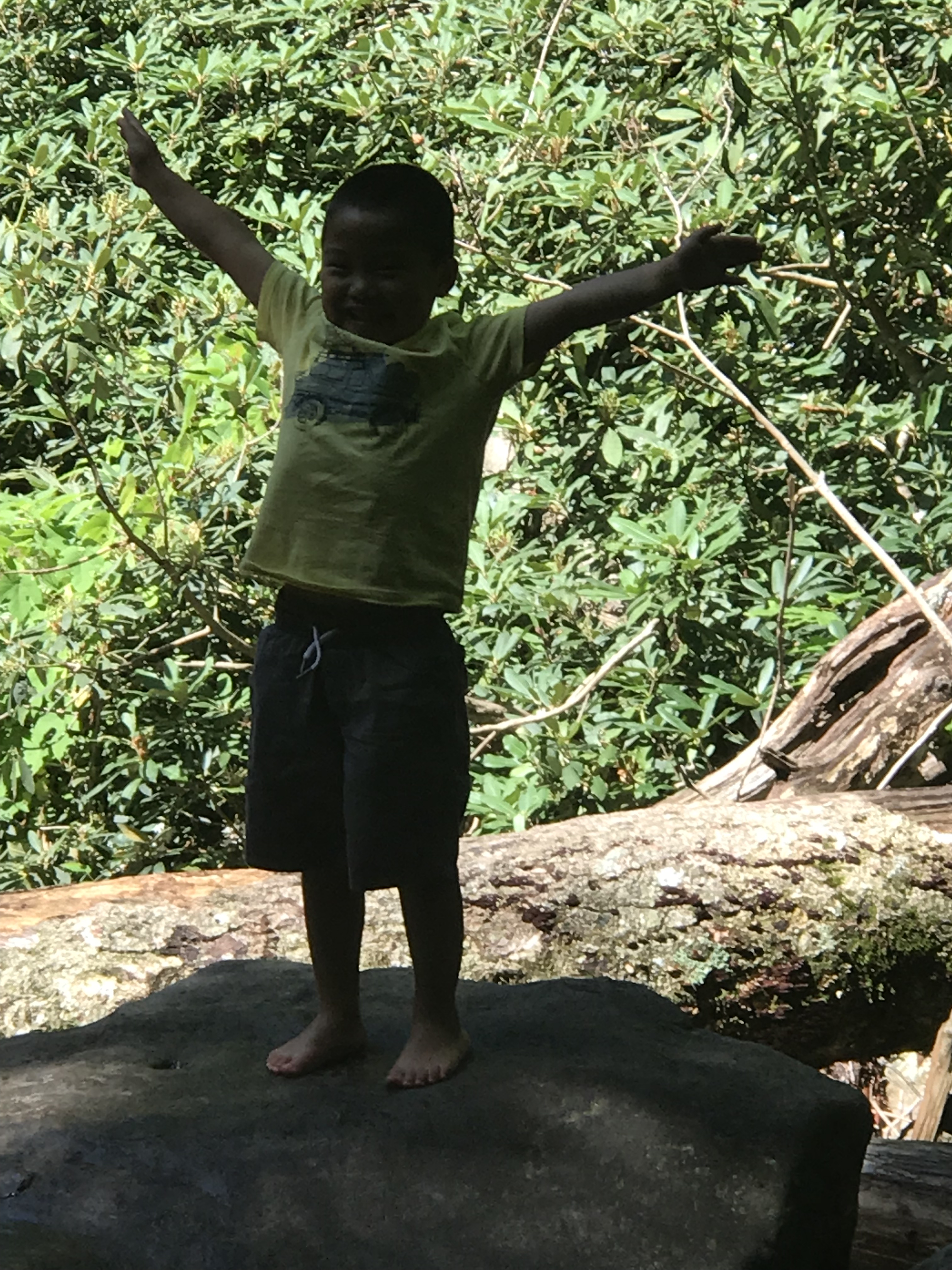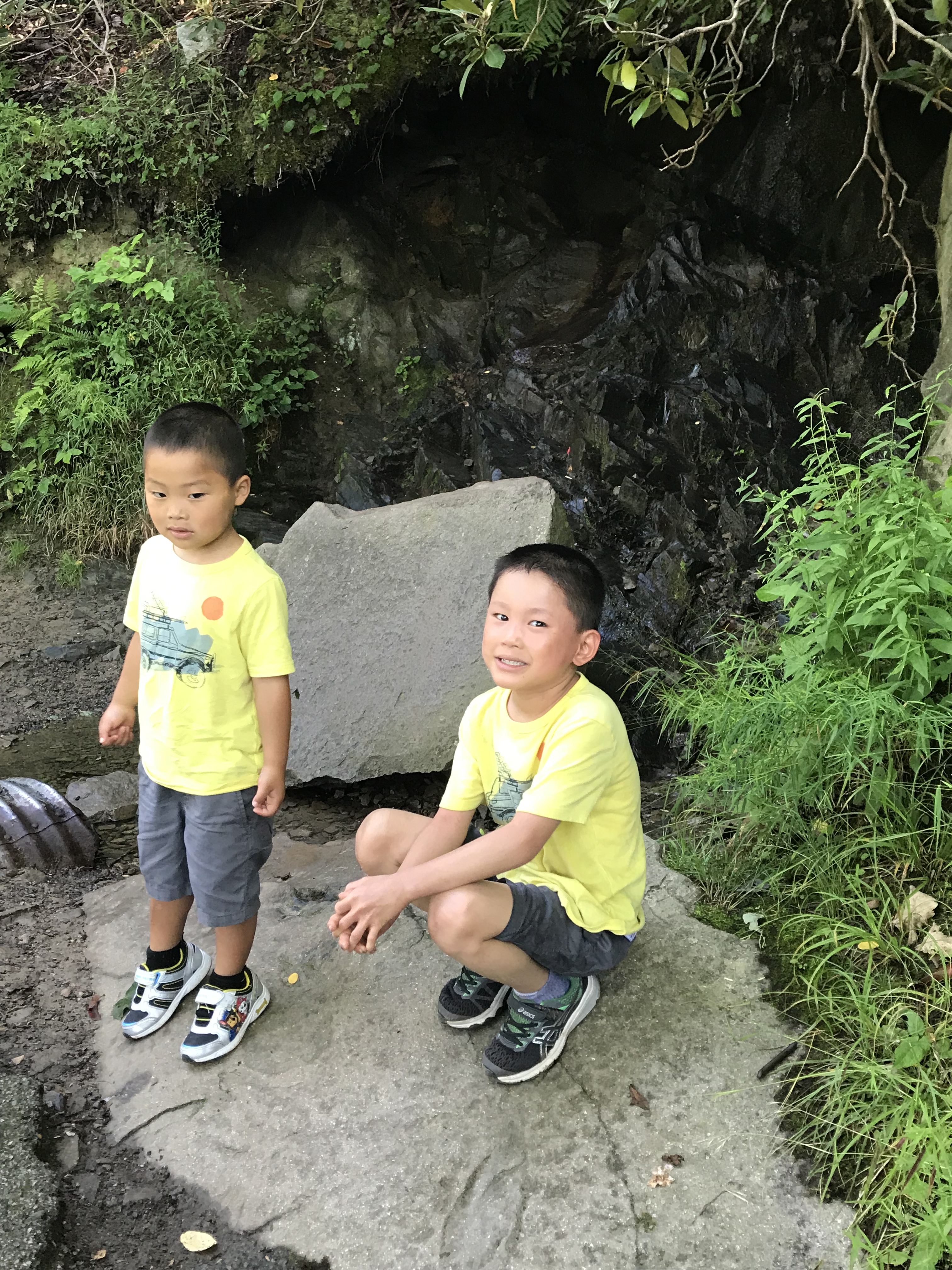 Once we arrived, they turned the pool and stream into a pre-historic playground. Running around. Exploring hidden corners. Will dunking his head in the cool mountain water. “I love mountain water.”