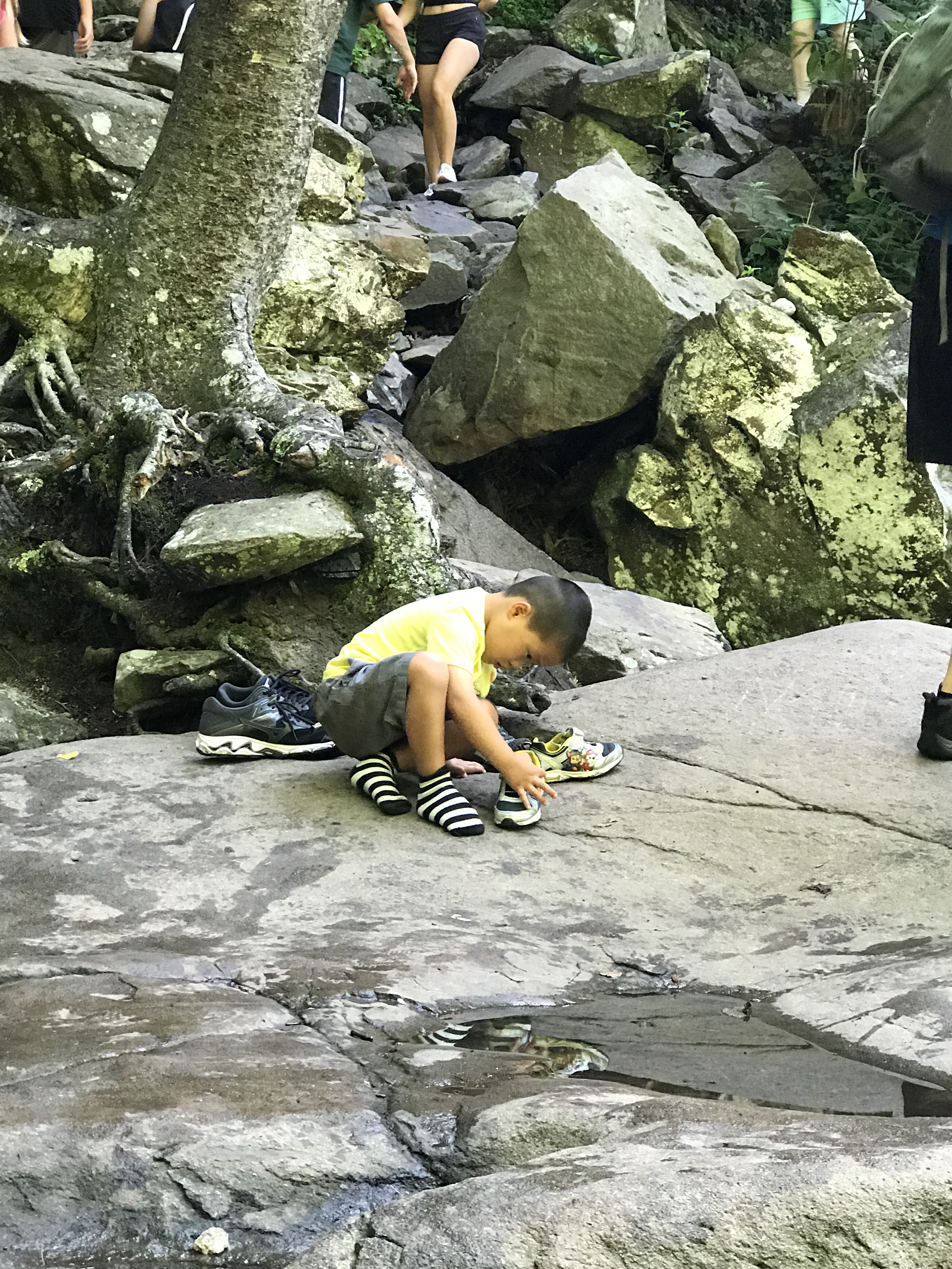As soon as we got to the top of the falls, my big boy immediately darted down the rocks leading from the top of the falls to the pool at the bottom. That is why I call him the mountain goat. I helped Lucey climb down at a biped pace.
