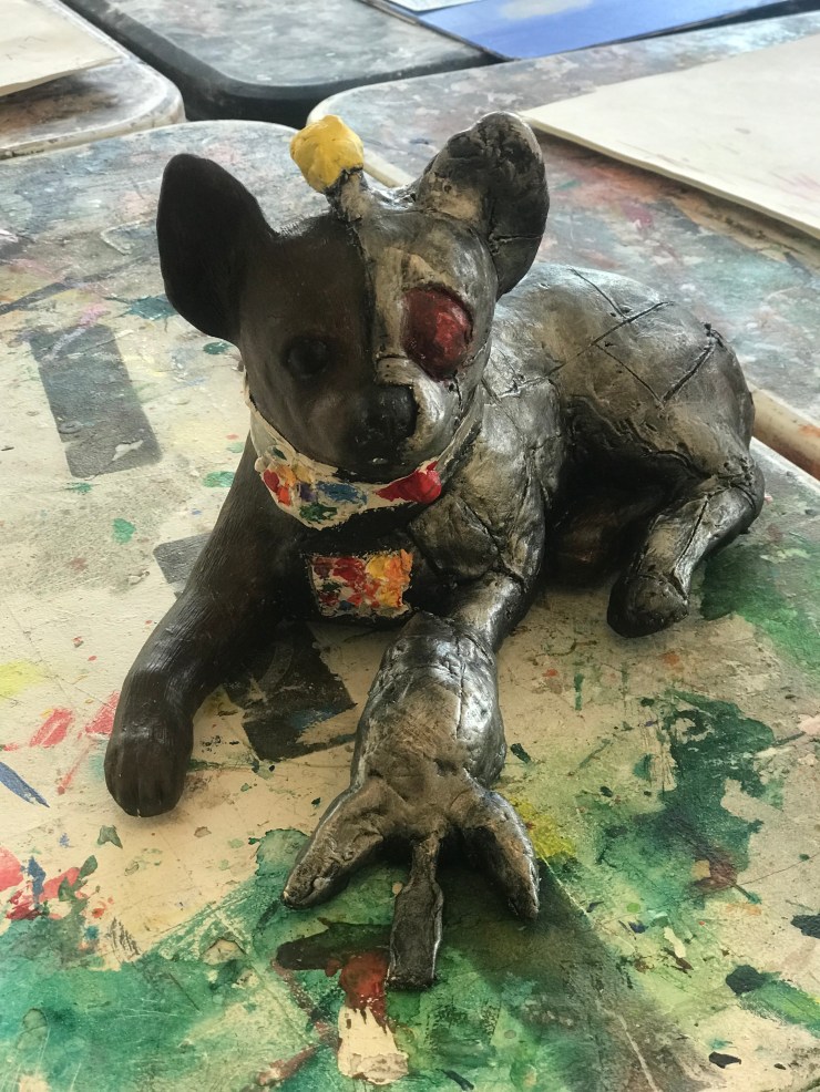 The local arts council in our neighboring town of Boonton sponsors a public art exhibit called the “Dog Days of Summer.” Local artists submit their ideas for a dog or cat sculpture and the Boonton Arts Council selects from the proposals. Will’s submission, Red Eye Mega Knife Cyborg Chihuahua Plushy Guy, was selected for display in one of the local businesses this summer. The proceeds from the art exhibit go to the local animal shelter.