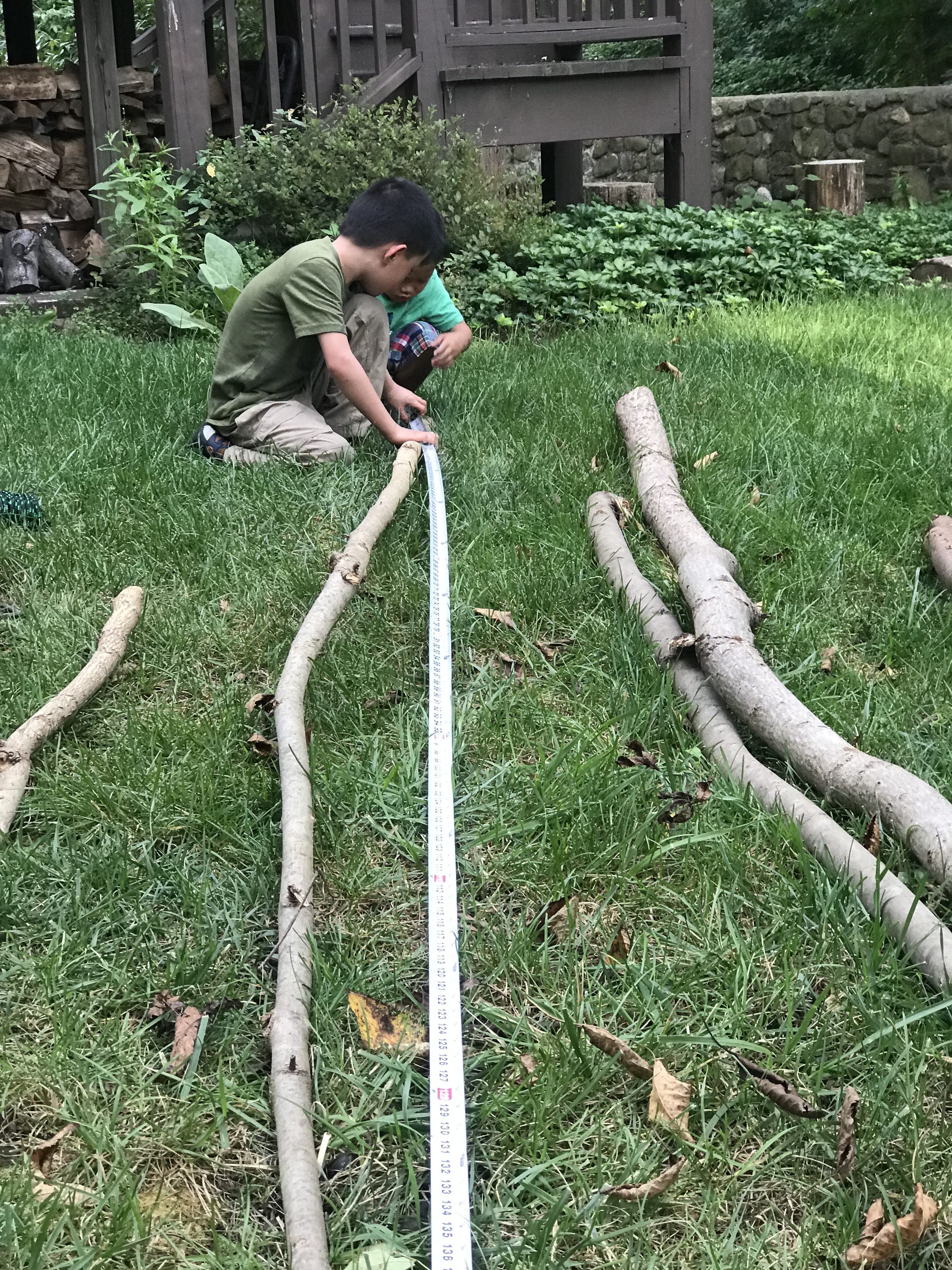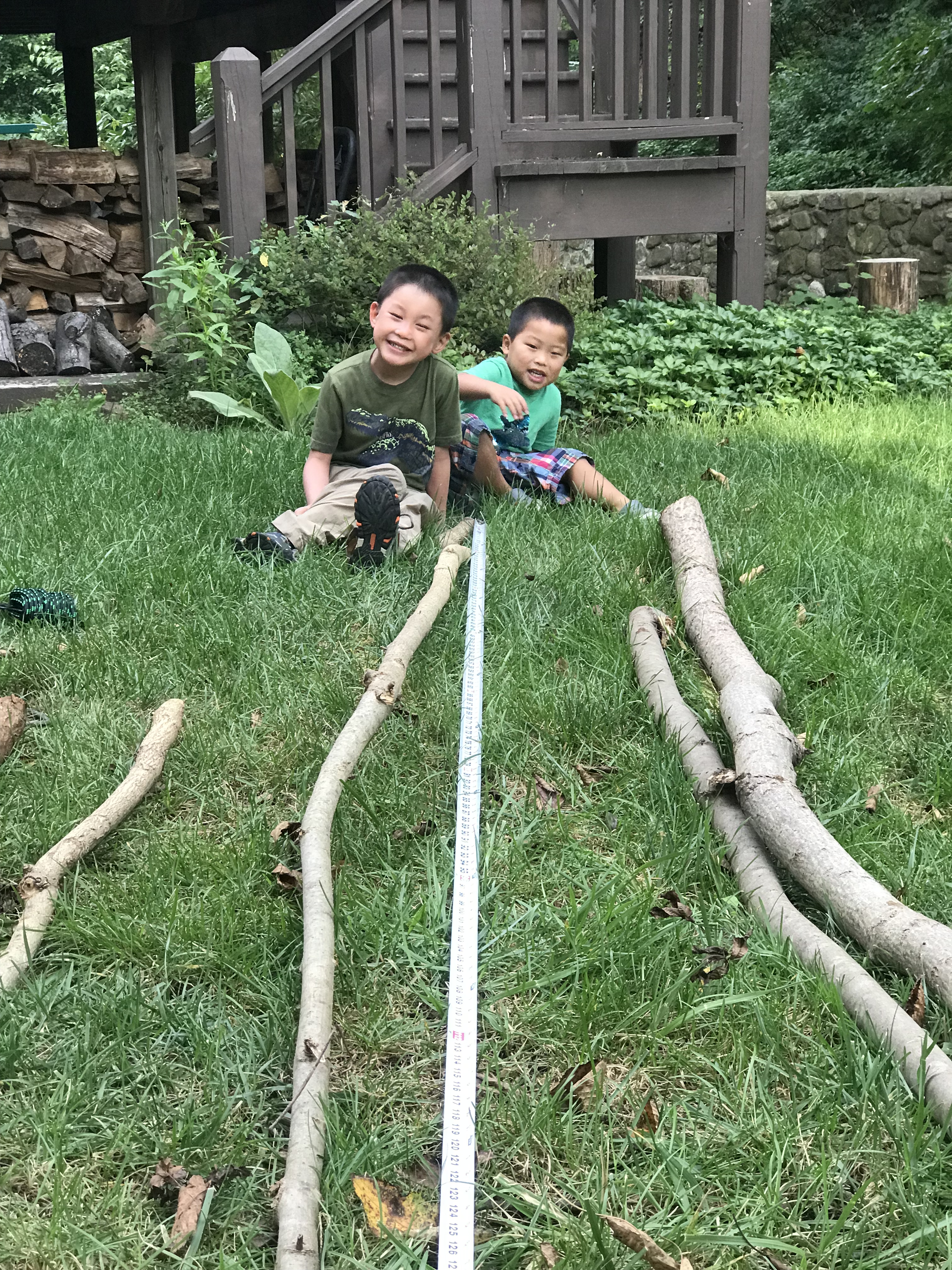 I also try to create projects where they get to build real things that they can use. One of my favorite projects with the boys this summer is a tipi we are building. They used real tools to build it. They used my tape measure to mark the 13′ spot on each pole. They cut the ends of the poles with my saws, although I had to confiscate my beloved $175 Lie-Nielson Tenon Saw from Will before he twisted the blade. They helped to raise the poles. They helped to secure the poles tightly together. They helped measure the base for the tarp. Soon they will help to cut and paint the tarp for the tipi cover.