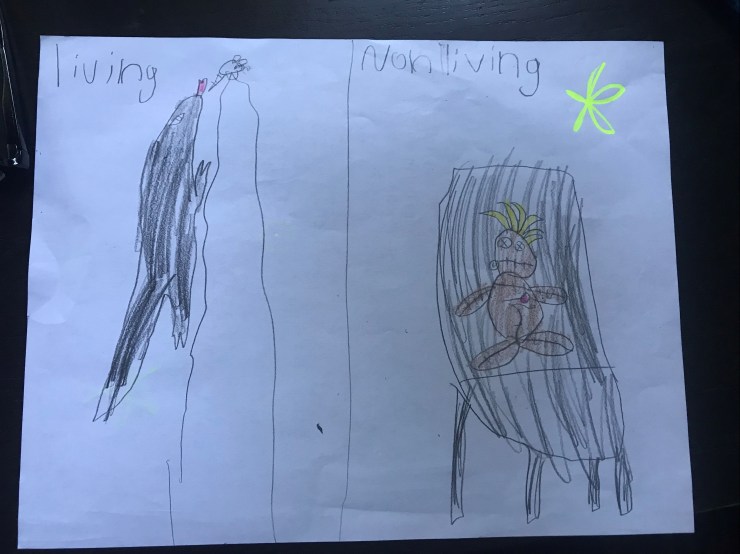 Yesterday in school Will’s class began discussing the difference between things that are living and things that are not. One of the student’s assigned activities was to draw something that is alive and something that is not alive.