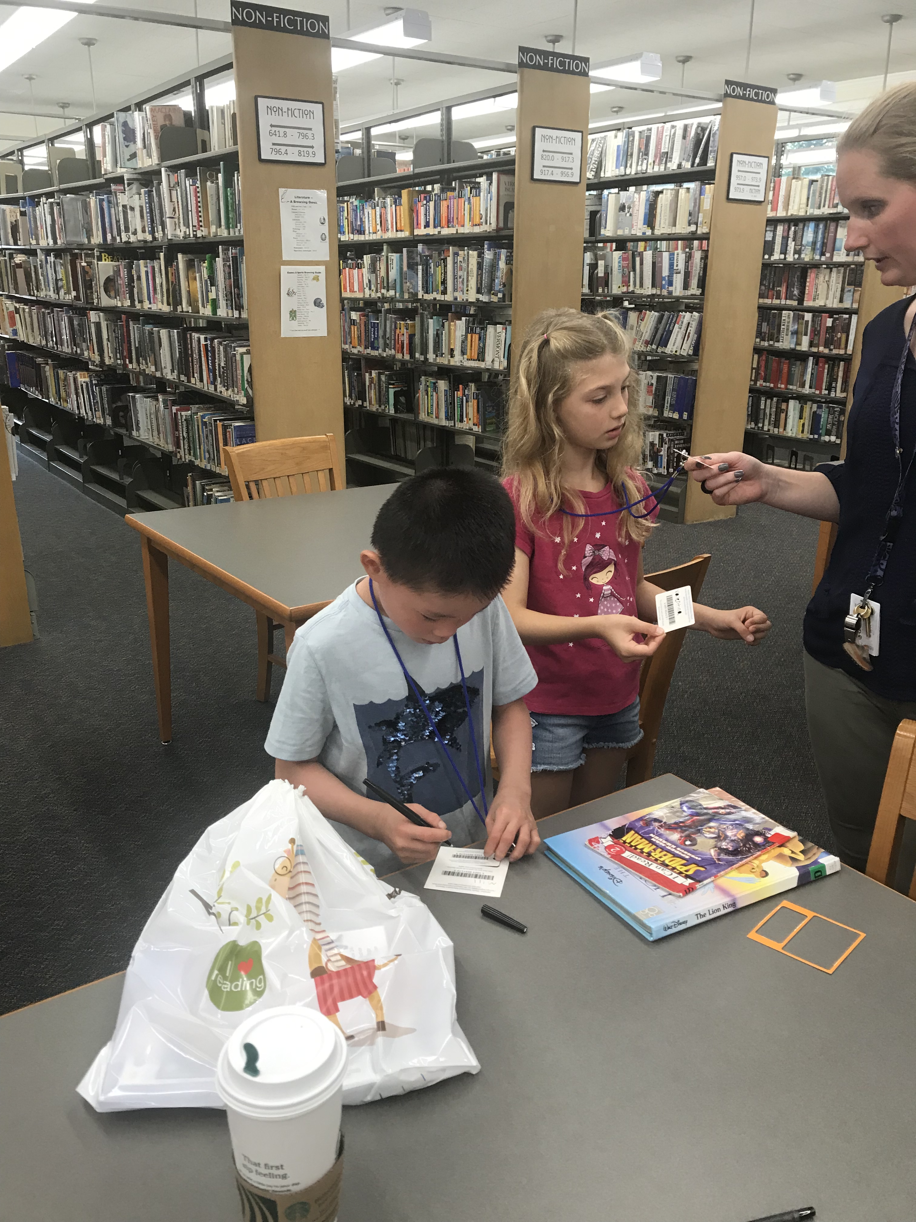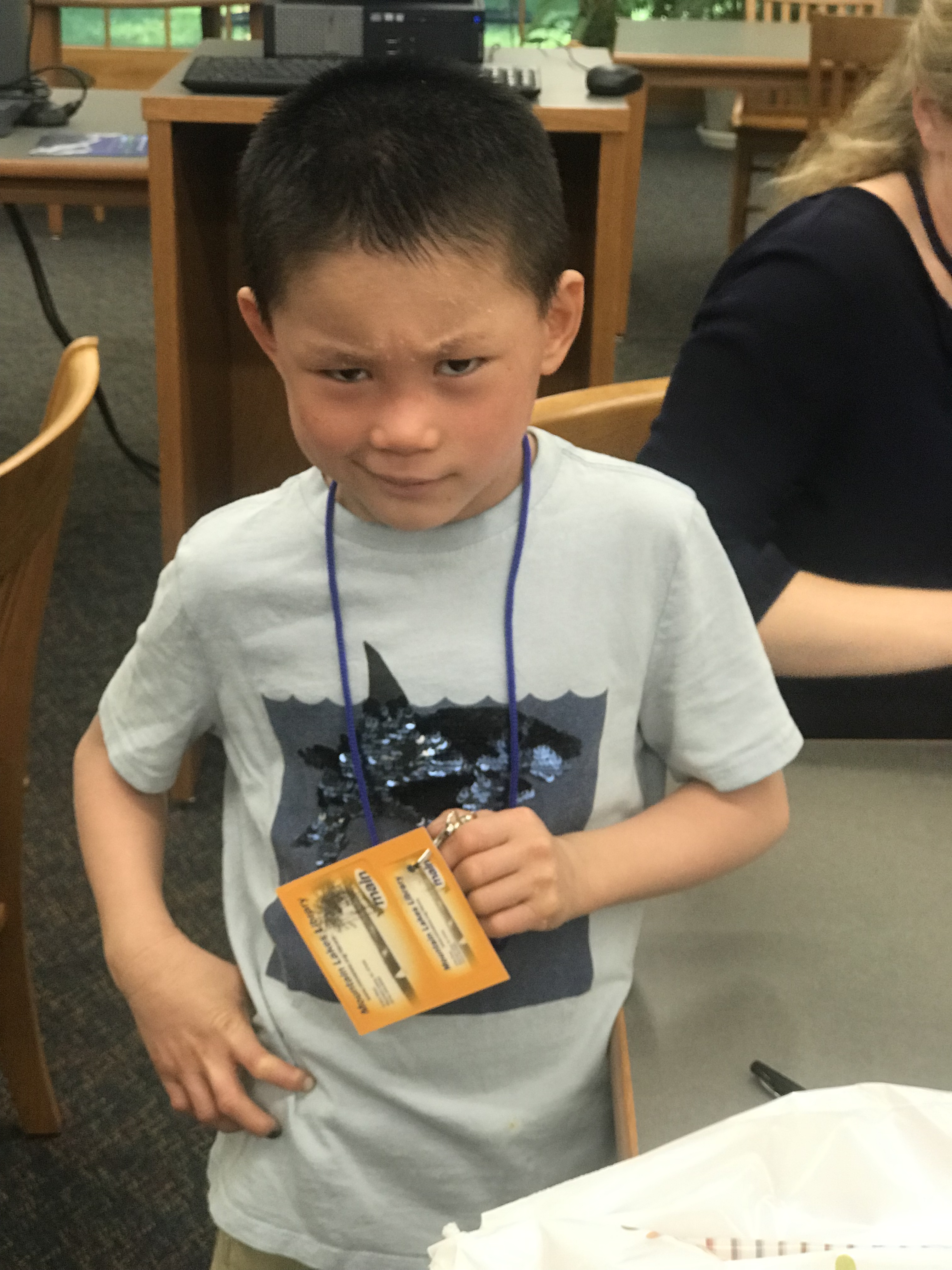 Of course, a few moments later he was back to the parts of his personality that I see every day. Asking the librarian if they have any books on animatronics. Making a bunch of robot noises and sound effects. Giving me an annoyed look because I wanted to take a picture of him with his new library card because I thought it was funny that he wrote his name both upside down and backwards.