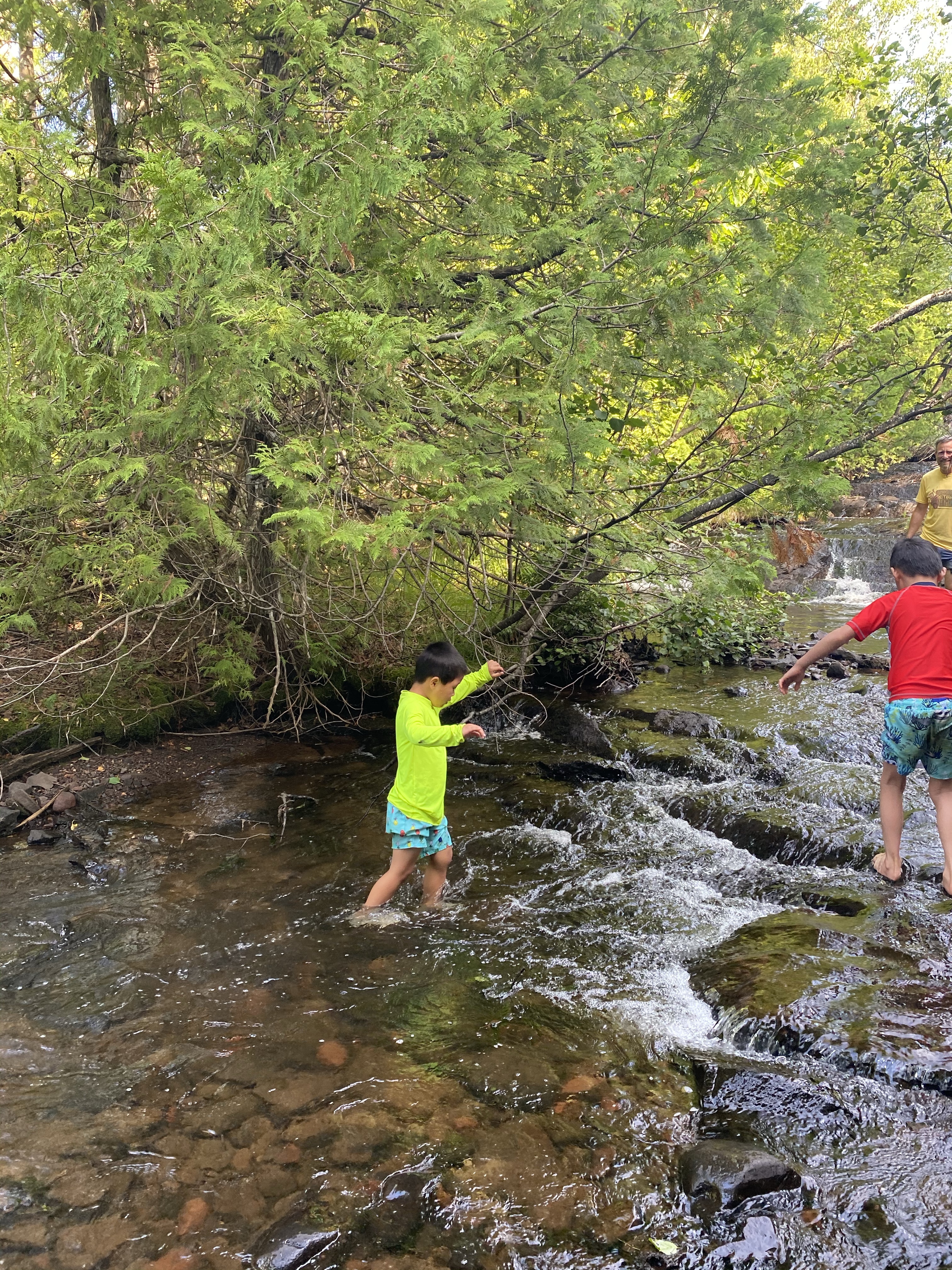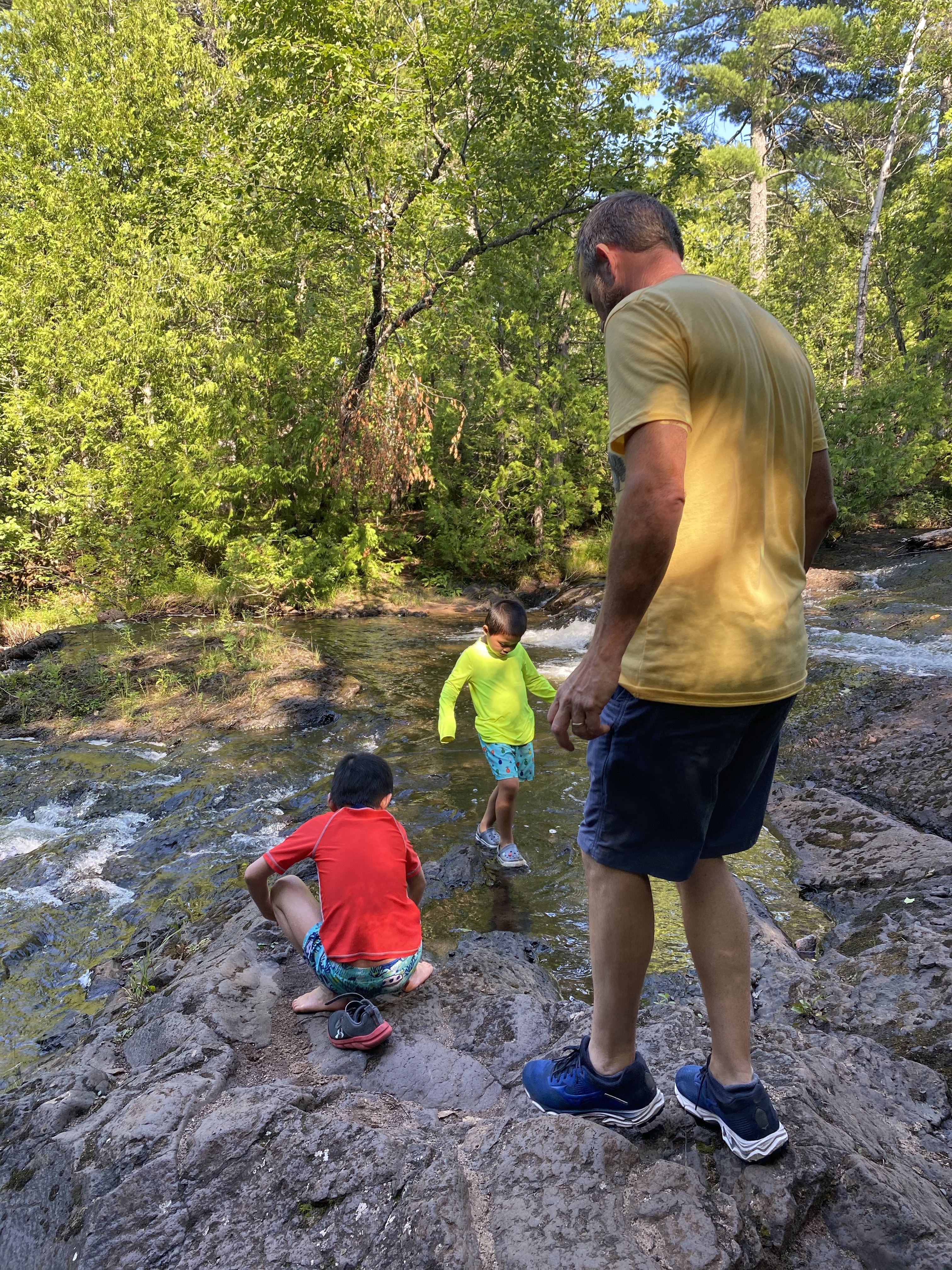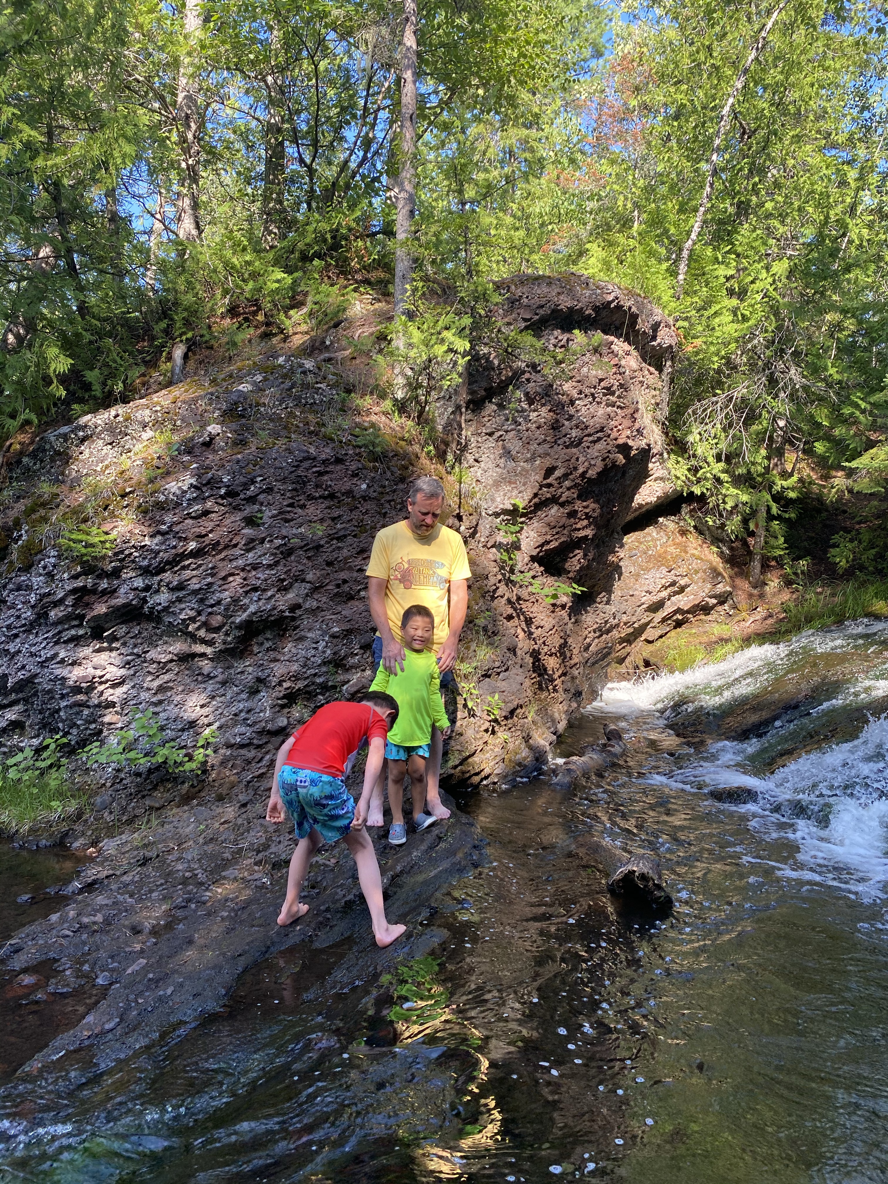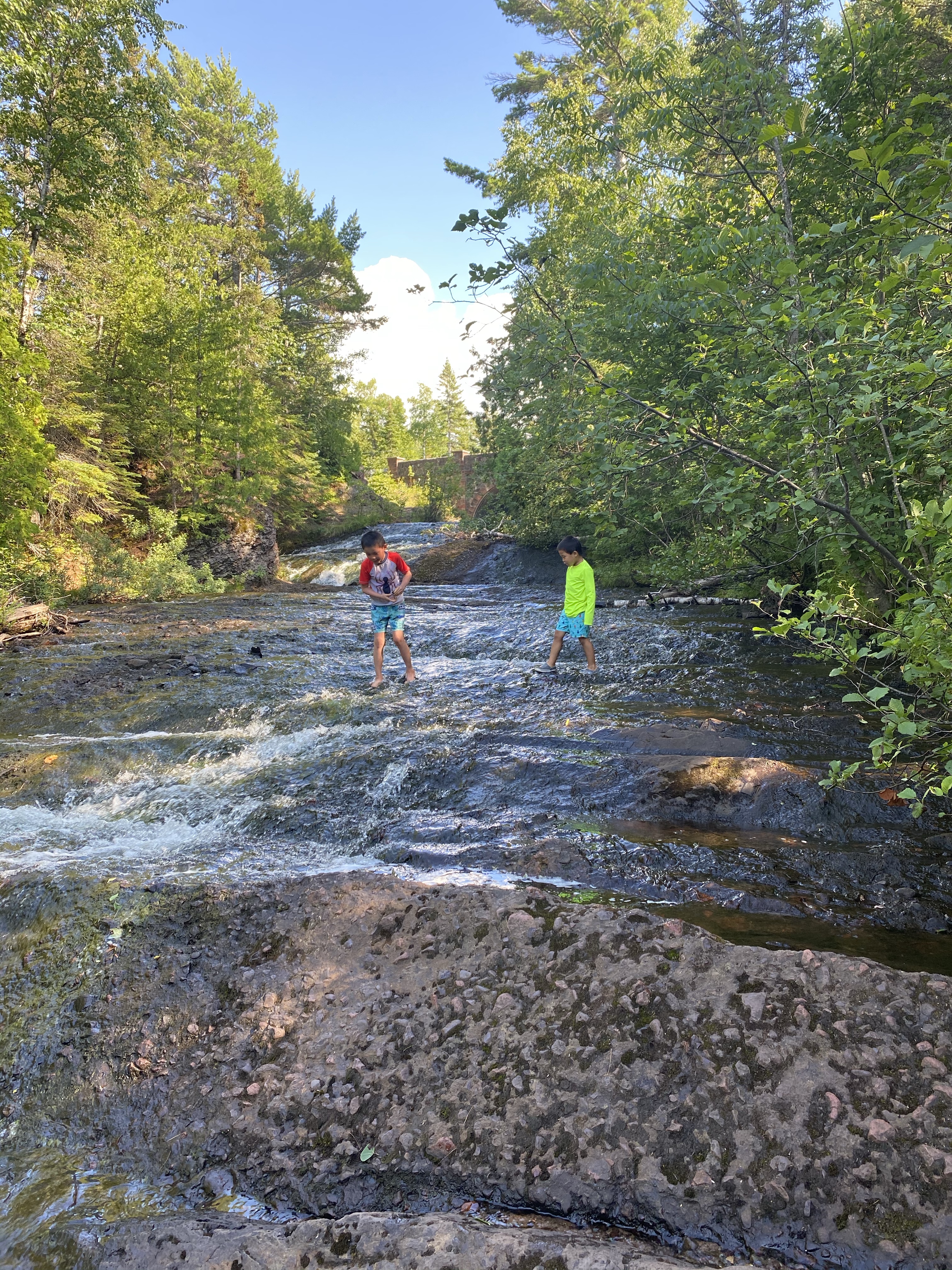 The Manganese Falls trails was too steep and precarious for a five year old and Jenny’s distinctly non-adventurous sandals so we drove around looking for a more accessible falls for the boys. On the way back to the campground, we found a wonderful little falls where they could explore, play, splash around, and slide down the rapids. Perfect for us.