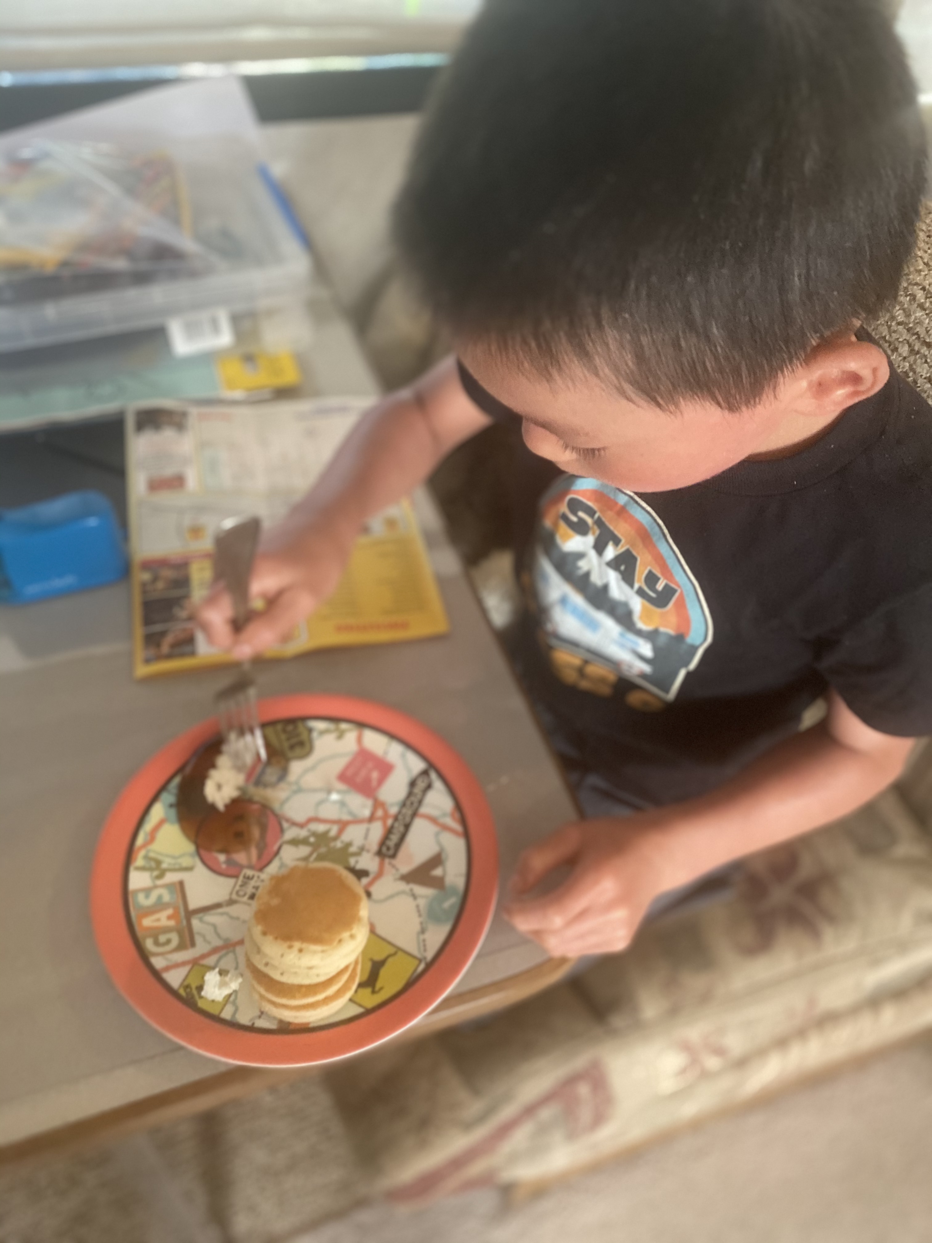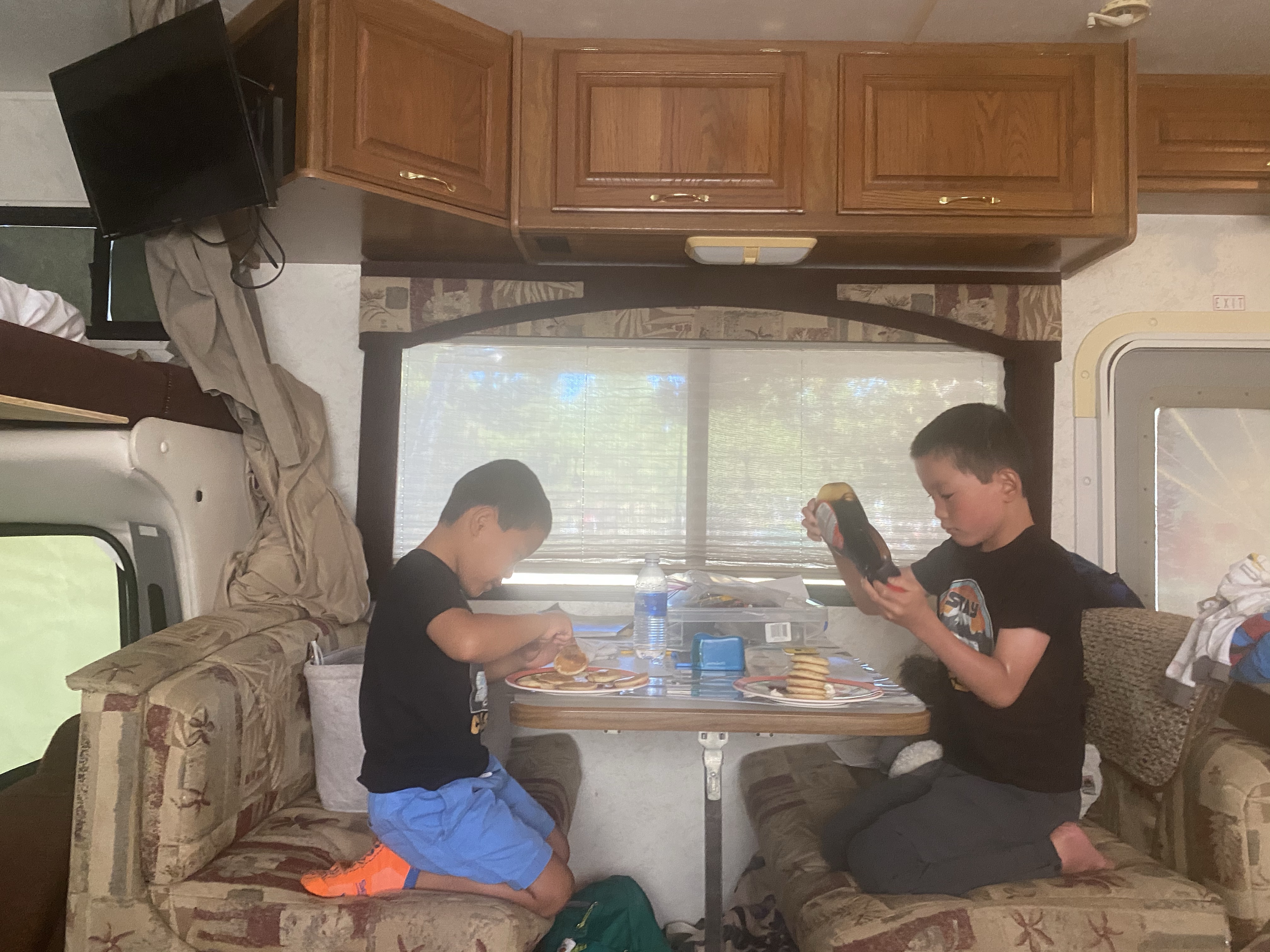 After breakfast, we headed to Yellowstone. For breakfast, I heated up some pre-made mini-pancakes. Will’s and Lucas’s approach to eating them in some inchoate way well captures the difference in their personalities.