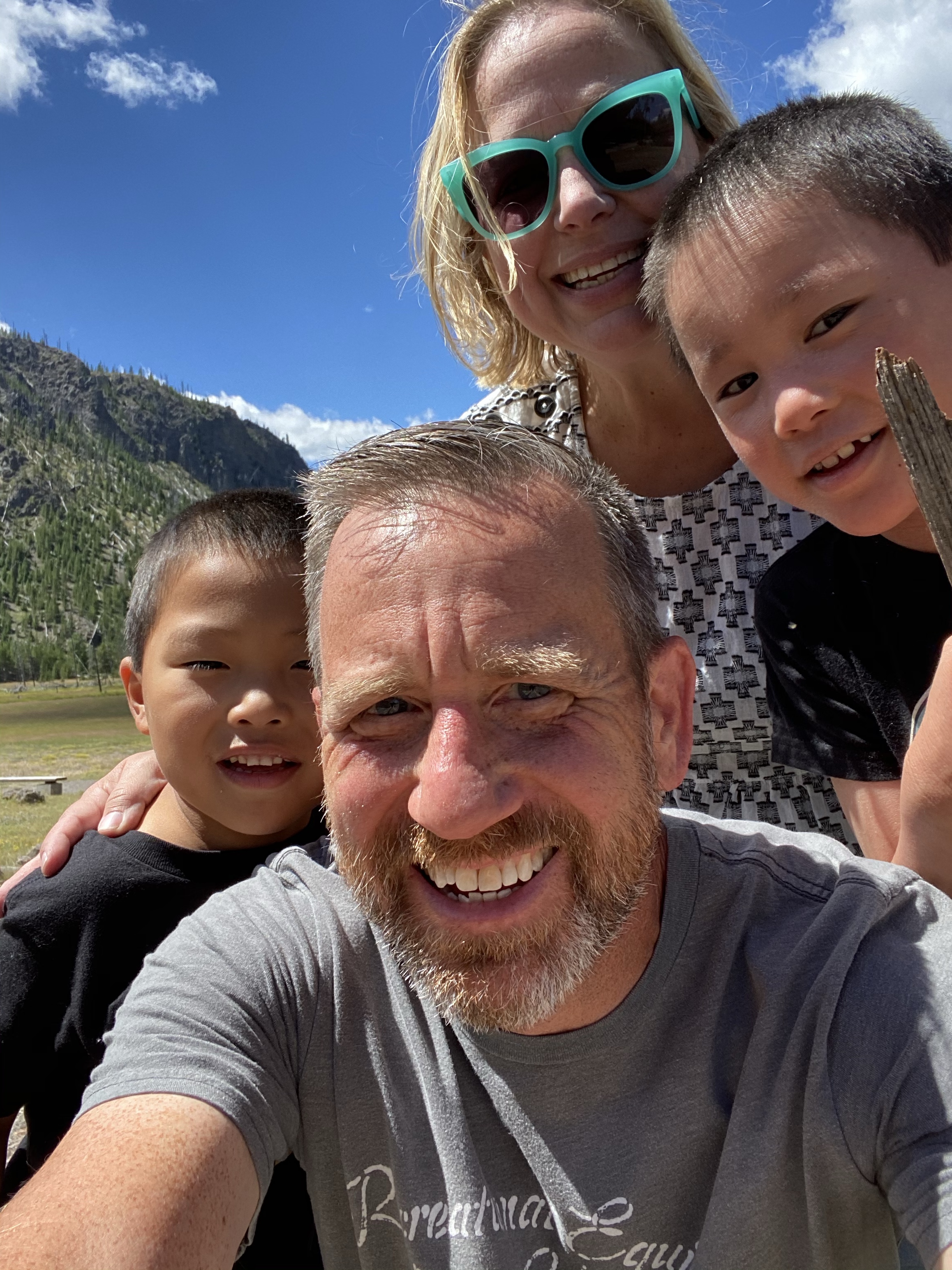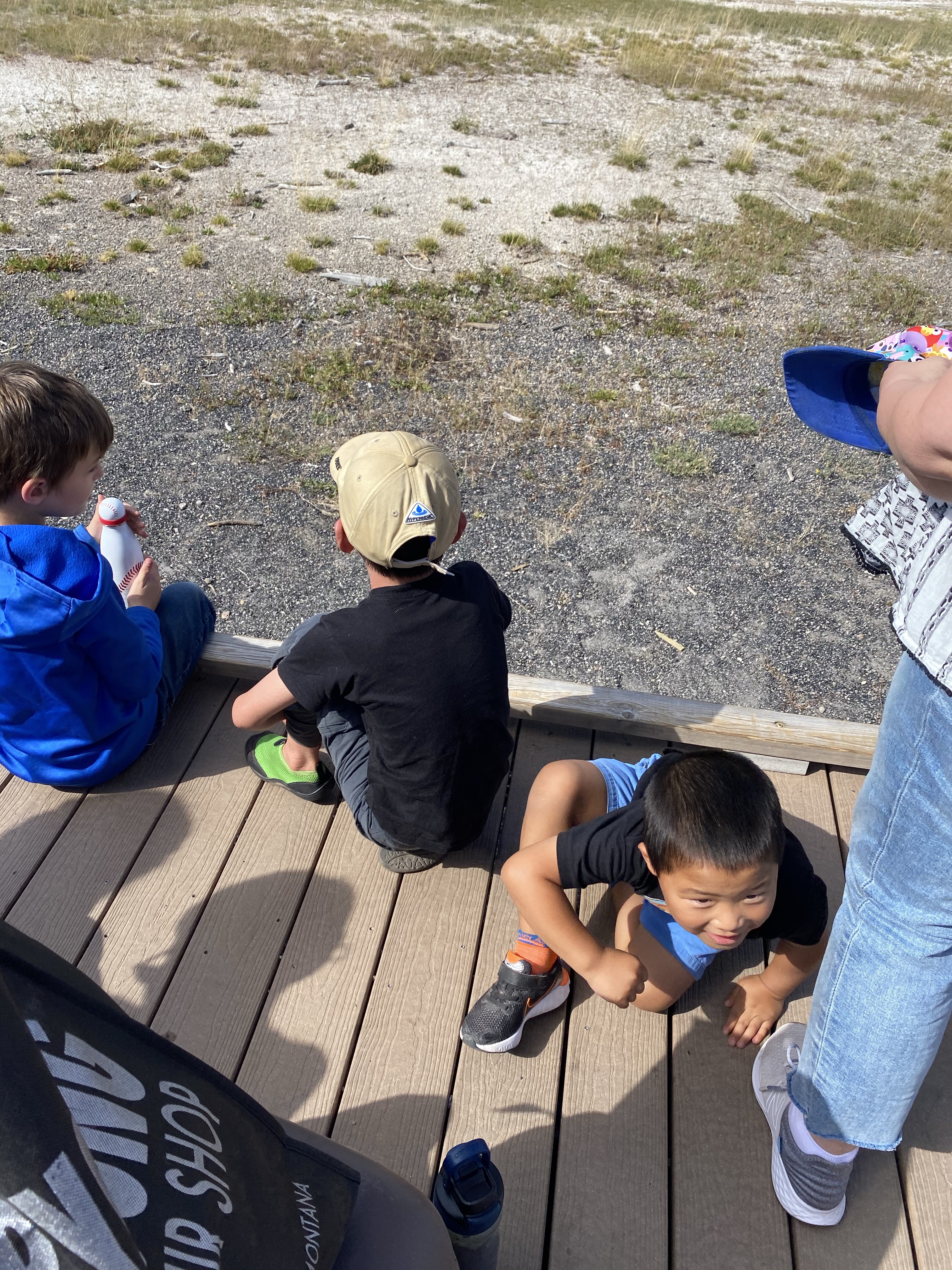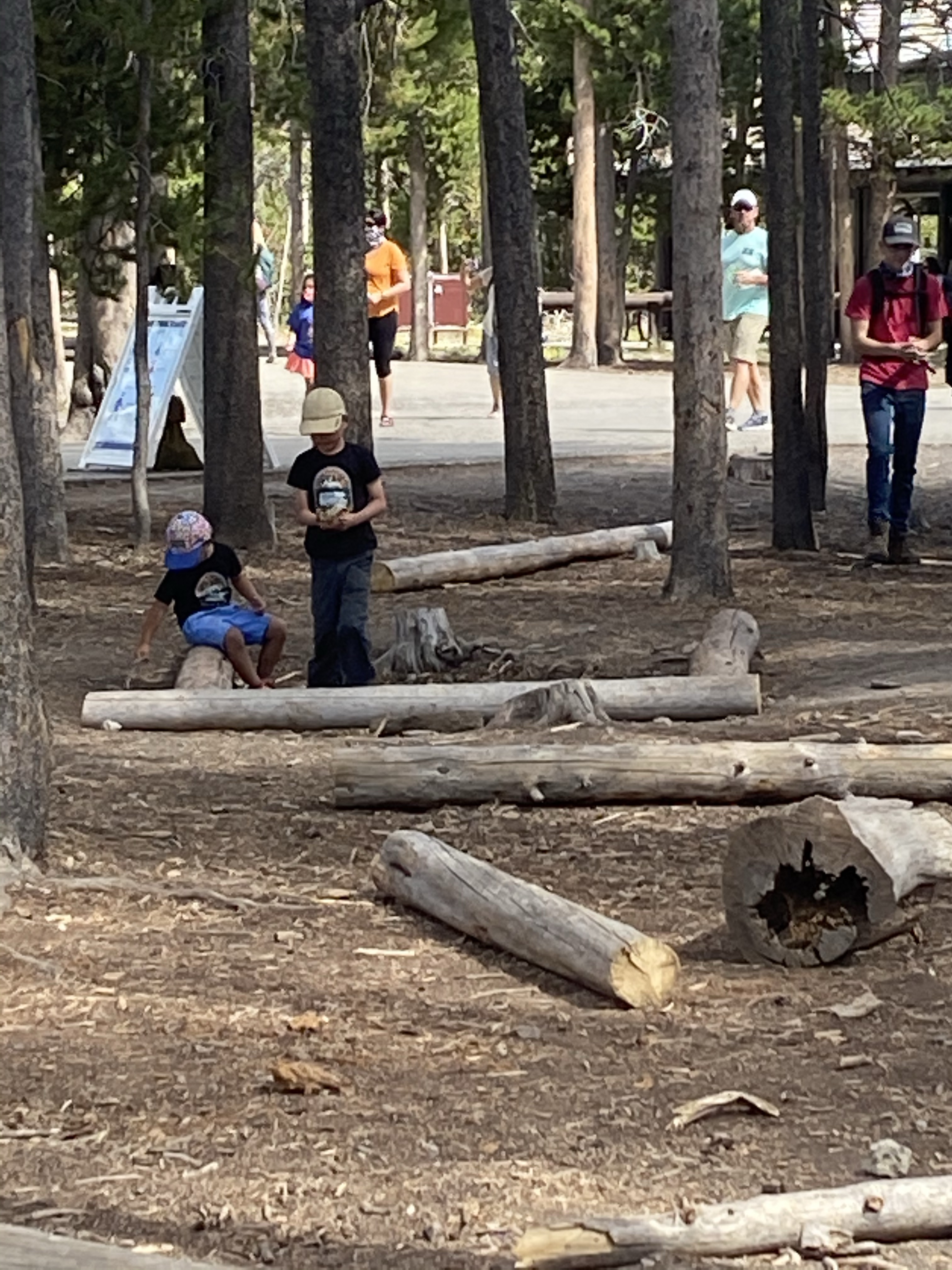 At Old Faithful, Jenny and the boys got ice cream at the General Store and I grabbed a seat for the next eruption. When they got back, the boys quickly set to work with another kid building a fort with logs laying on the other side of the platform. Then they found a set of sticks that looked liked guns that eventually had to be confiscated from Lucas because he wouldn’t stop pretending to shoot people, which led to lots of crying. We watched Old Faithful, where the boys again quickly found a transient friend to talk to during the eruption about then things kids think about geysers.