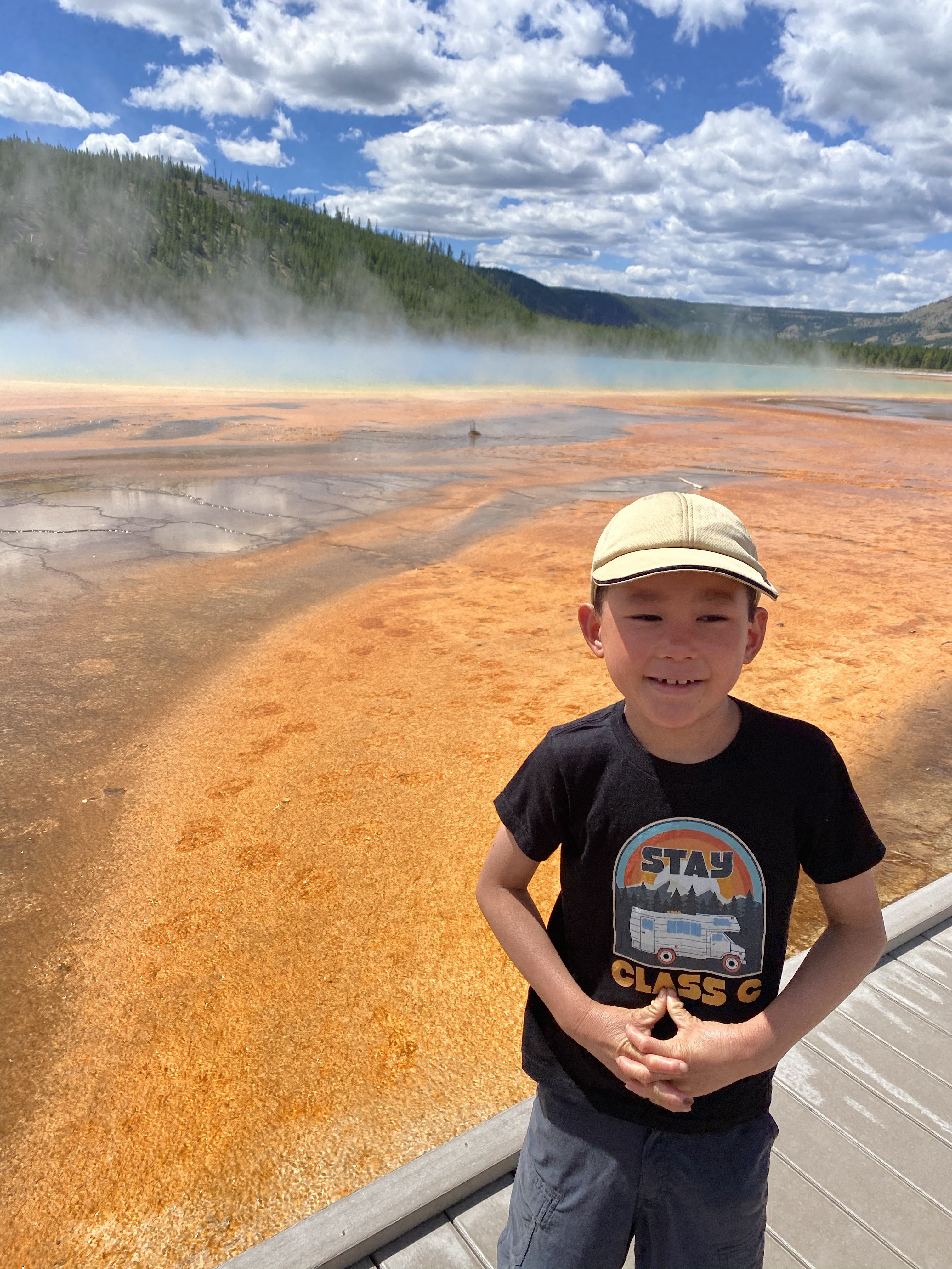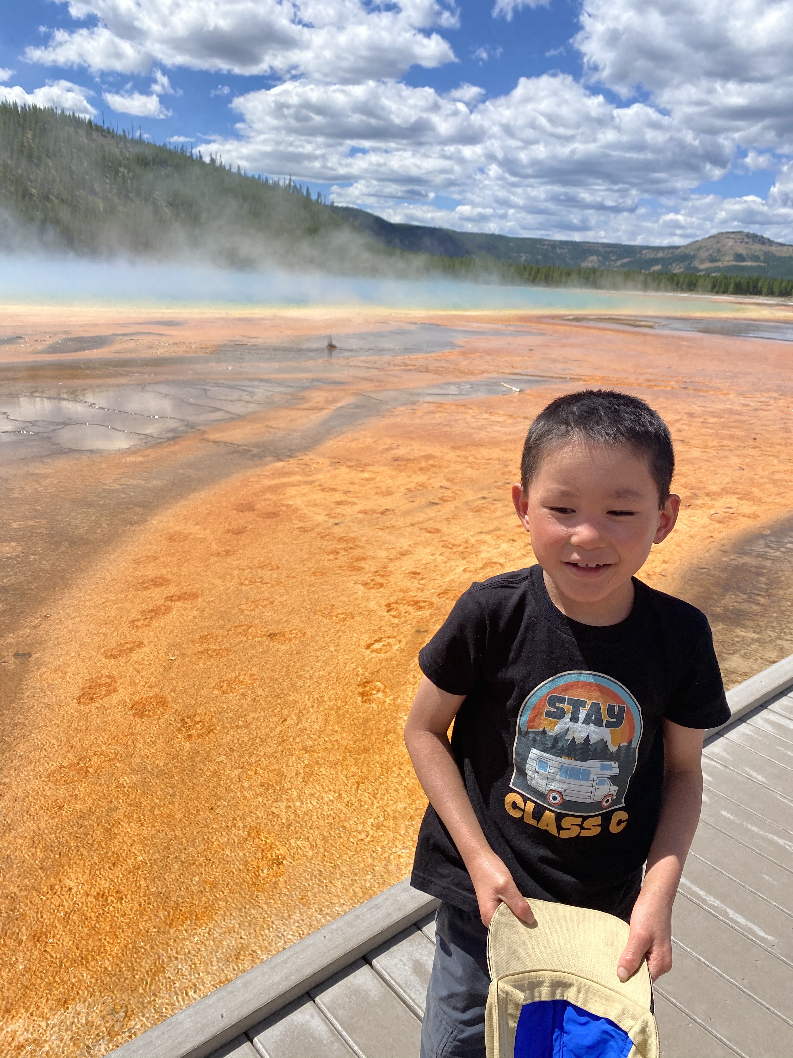 We stopped next at Grand Prismatic Springs. The springs are amazingly beautiful like everything else here. Will had lots of questions and wanted to smell each of the different colored springs. He is the kind of kid who needs to touch and smell everything and do little experiments (for example, he wanted to see what would happen if we poured water into the spring, which we didn’t do) to feel like her understands what he is seeing. Lucas said he was bored and wanted carried.